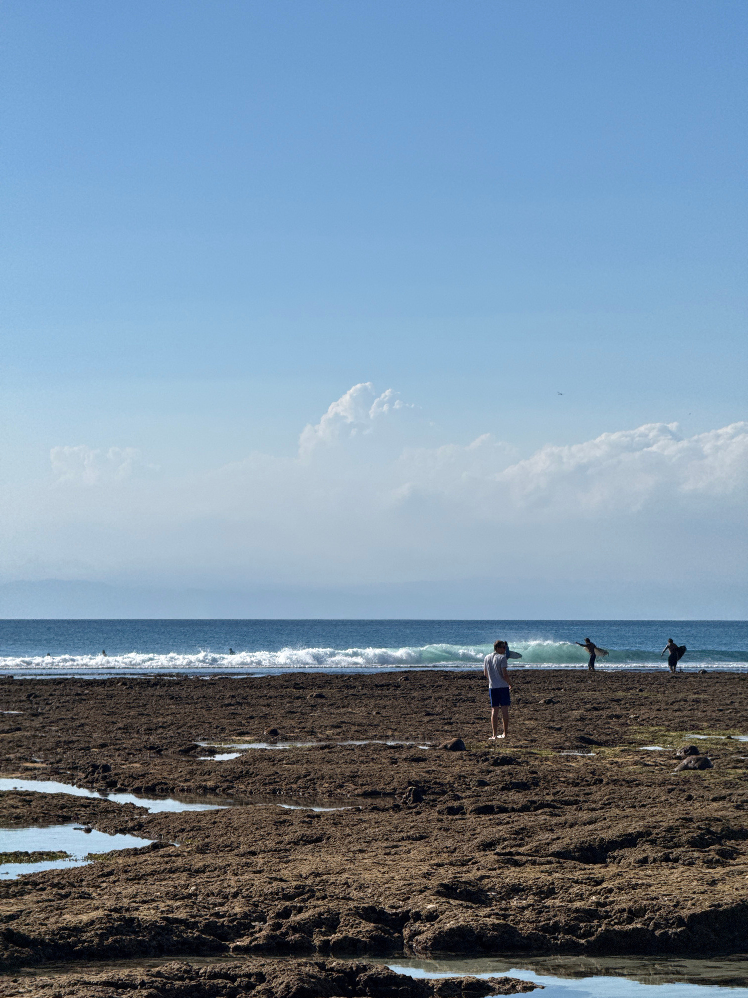 When viewed in its correct orientation, the image captures a sunny coastal scene, likely in Kuta Selatan, Indonesia. The upper portion of the frame features a clear, expansive blue sky dotted with sofโฆread more
