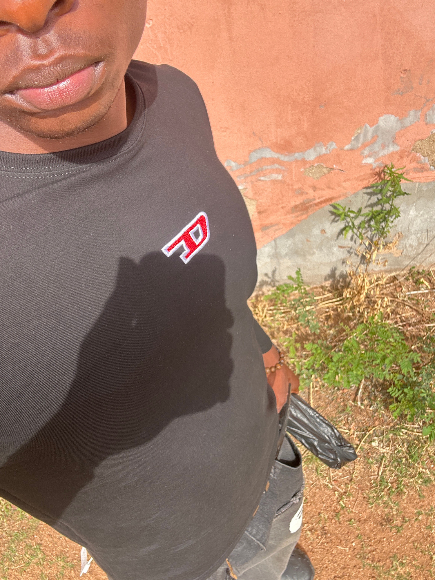 The image shows a close-up view of a person wearing a black t-shirt with a red "R" logo. Part of the person's face, specifically their lips and chin, are visible in the lower-left corner. The backgrou…read more