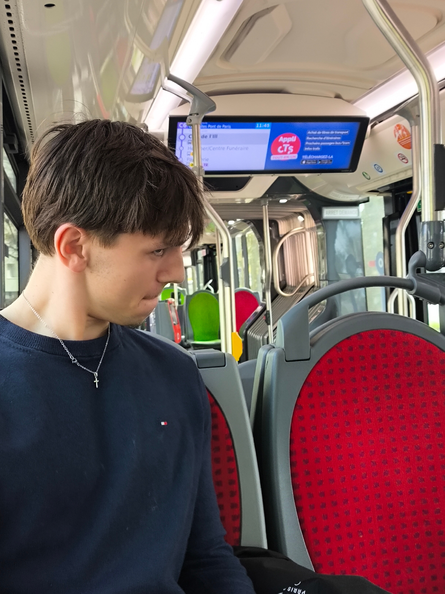 Here's a detailed description of the image: **Scene:** Interior of a CTS (Compagnie des Transports Strasbourgeois) bus in Strasbourg, France. The image is taken from the perspective of a passenger, l…read more