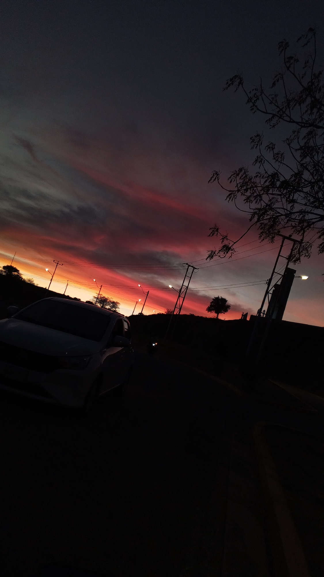 A nighttime or dusk scene captures a car parked on a road. The sky is filled with striking shades of red, orange, and grey, indicating a vibrant sunset. Power lines and utility poles stretch across thβ¦read more