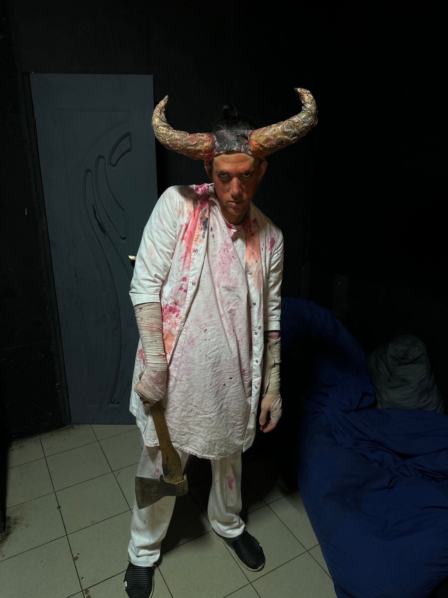 A person in a costume resembling a demonic butcher stands indoors holding an axe. They have prominent horns attached to their head, wear a blood-splattered white outfit with bandaged arms, and dark sn…read more