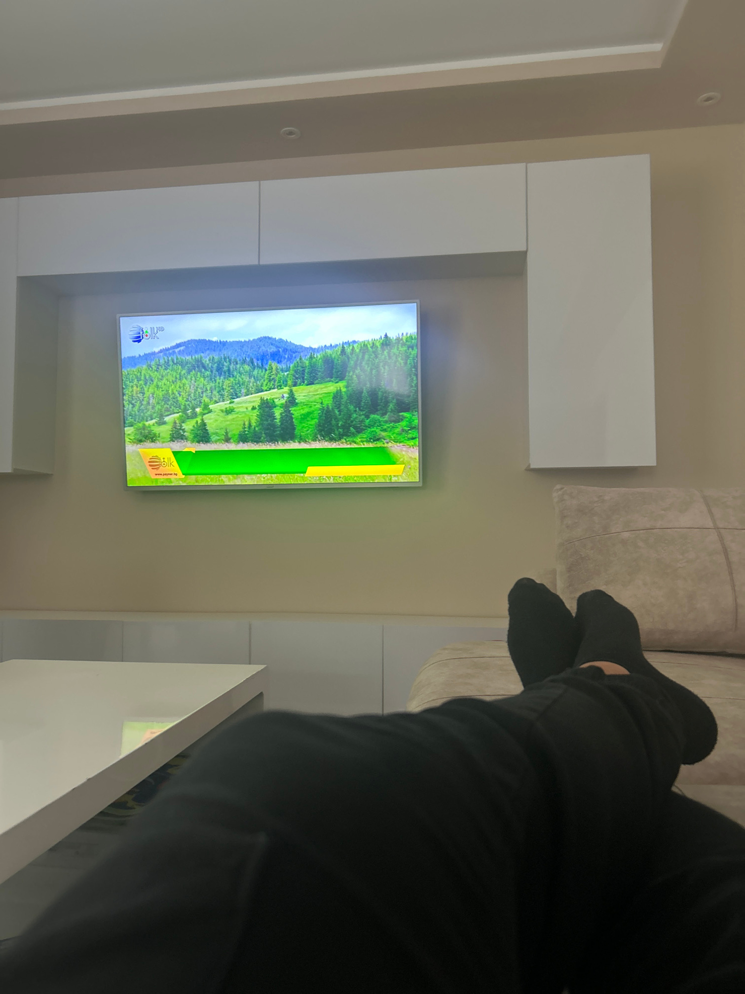 A person is sitting on a beige sofa with their legs up. They are wearing black socks and black pants. In front of them is a white coffee table. On the wall is a television that is displaying a landsca…read more