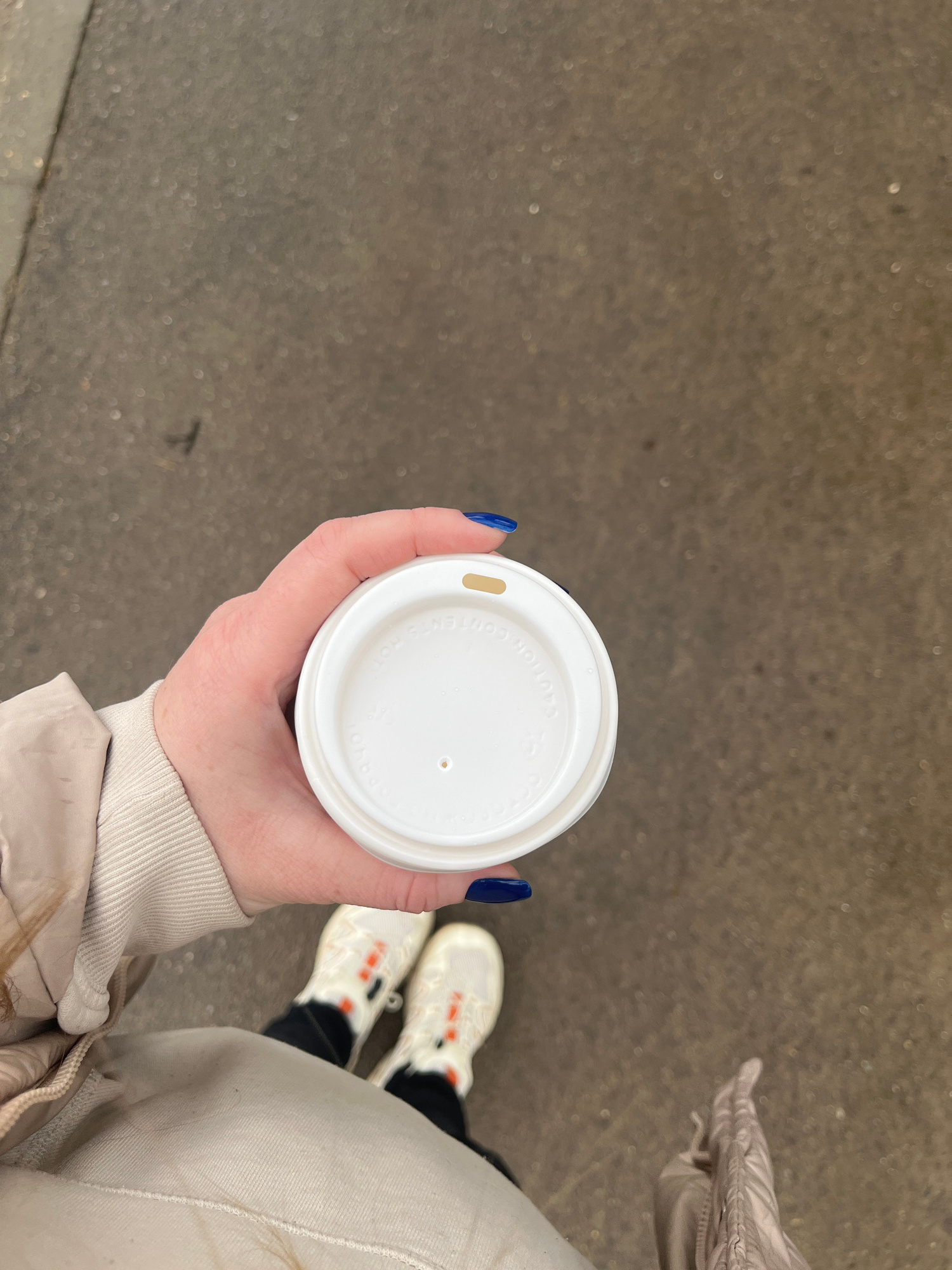 The image shows a person holding a white disposable coffee cup with a white lid, which has a small hole in the center and a sliding vent. The person is wearing a light-colored jacket and white sneaker…read more