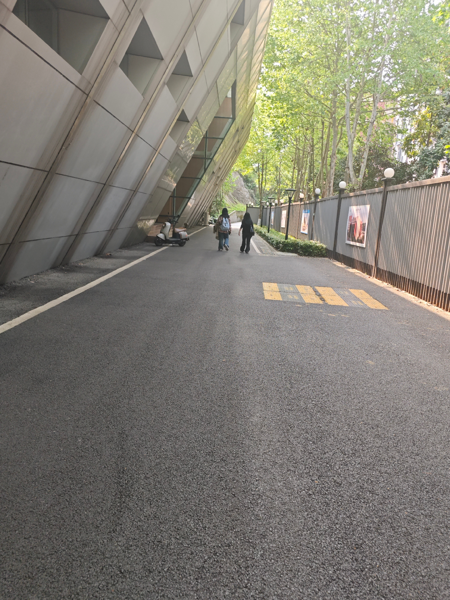A paved pathway runs between an angled, modern building and a metal fence in the Chongqing High-tech Zone, China. Two people walk away from the camera on the path. One wears a backpack. A moped sits p…read more