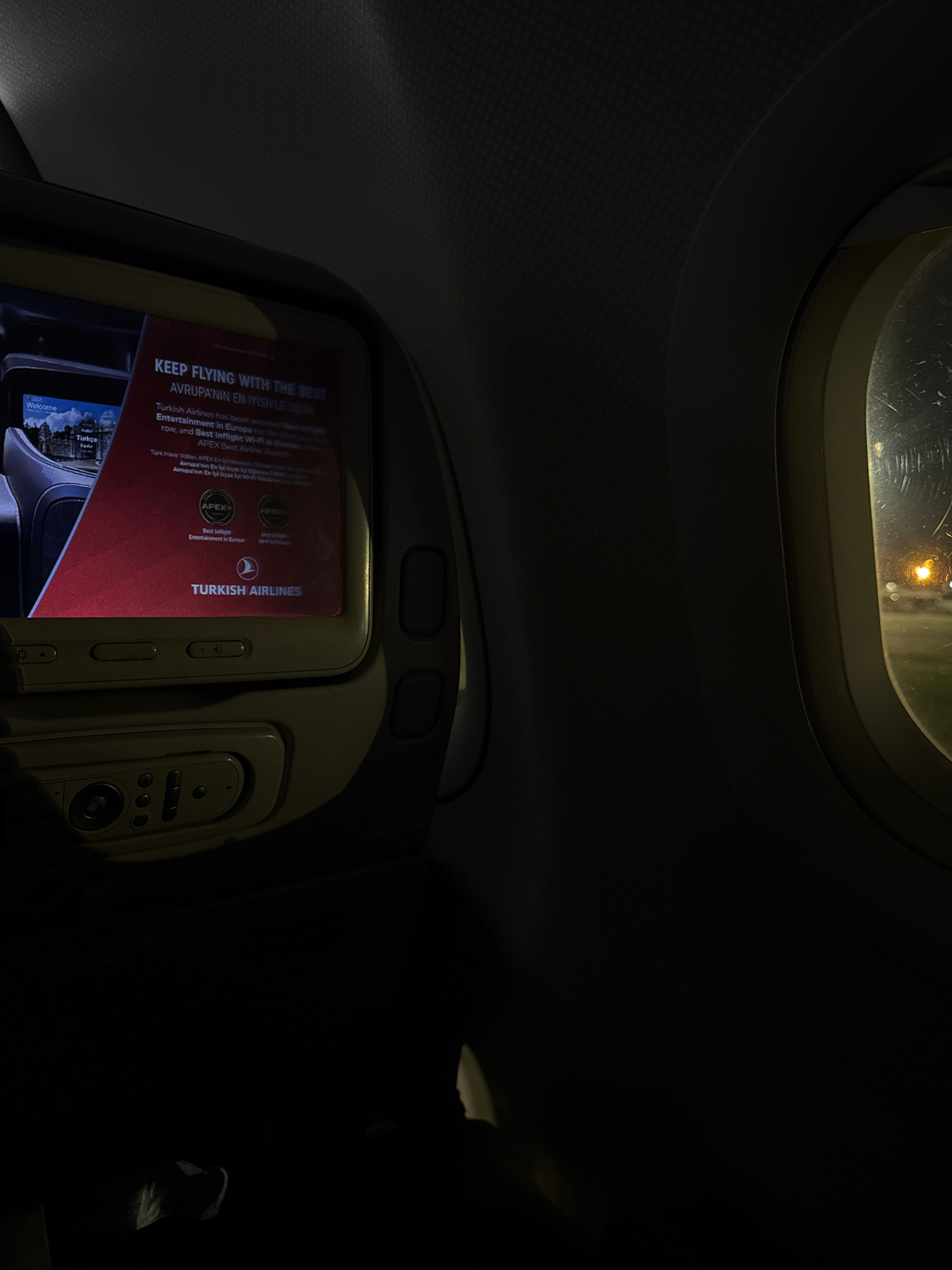 The image depicts the interior of an airplane cabin at night, specifically at Belgrade Nikola Tesla Airport (BEG) in the city of Surcin Urban Municipality, Serbia. The scene is dominated by a lit in-fâŚread more