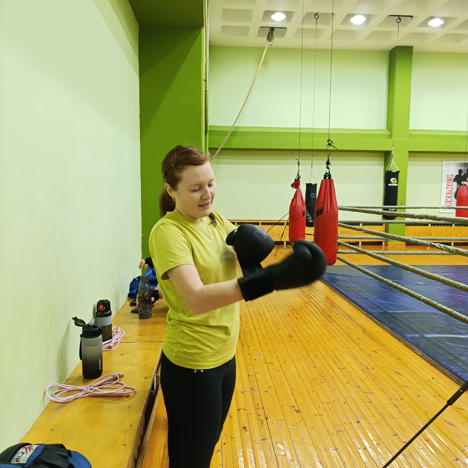 A fair-skinned woman with red hair is putting on black boxing gloves in what appears to be a boxing gym. She is wearing a yellow short-sleeved shirt and black leggings. To her left is a long wooden beβ¦read more