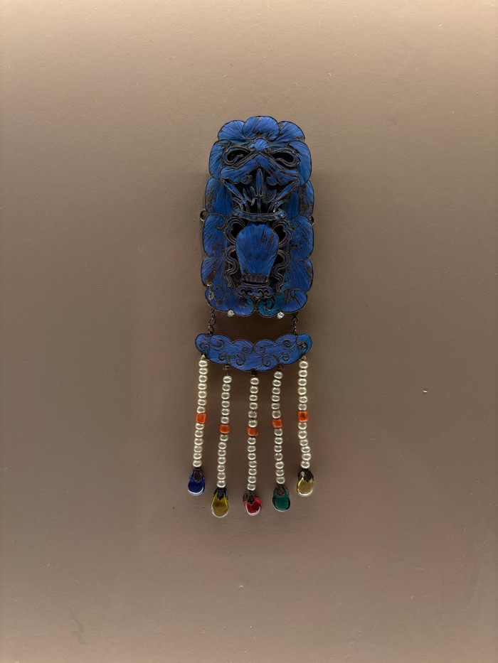 An ornate, elongated decorative object, approximately 30-35cm in length, is centrally displayed against a plain, matte light brown background. The object is primarily a deep, rich blue with black outl…read more
