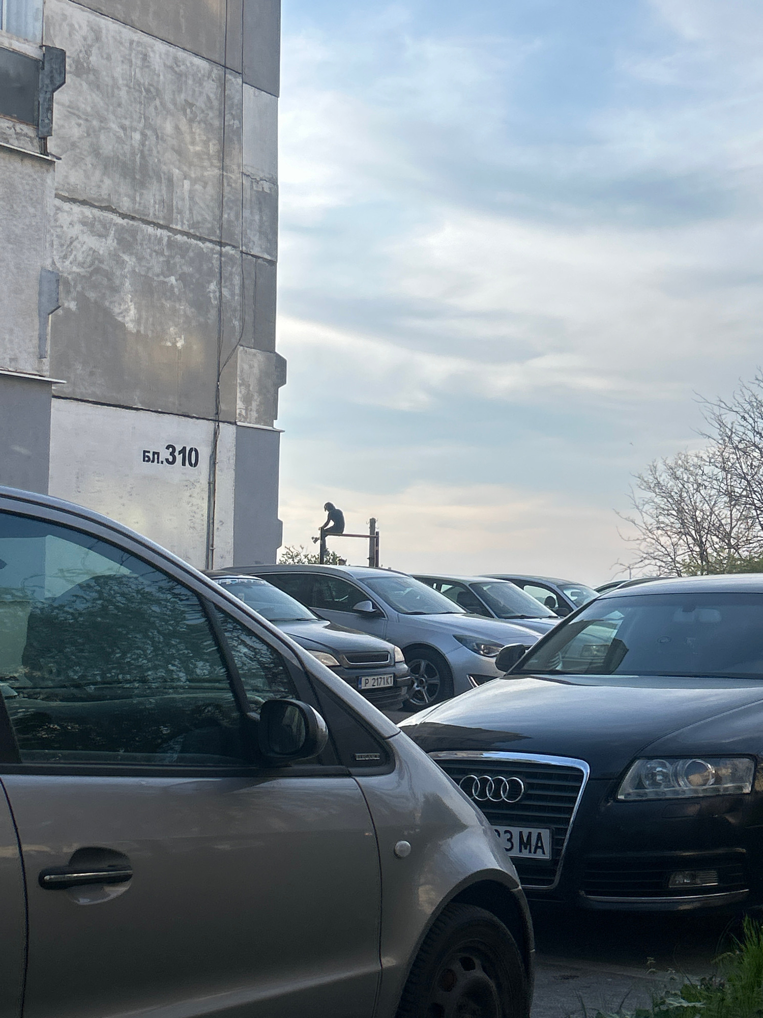 The image shows a street scene in Ruse, Bulgaria, with several parked cars in the foreground. A building labeled "бл. 310" is visible on the left. In the background, a person is perched on a utility p…read more
