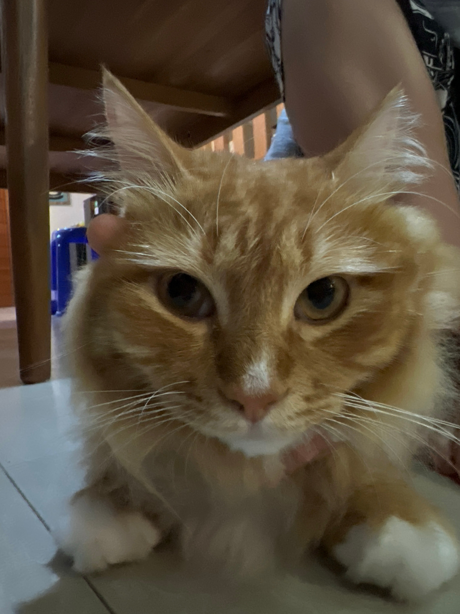The image shows a close-up of an orange and white long-haired cat with golden eyes. The cat is being held or is resting on a person's arm, which is visible in the lower right corner of the image. The…read more