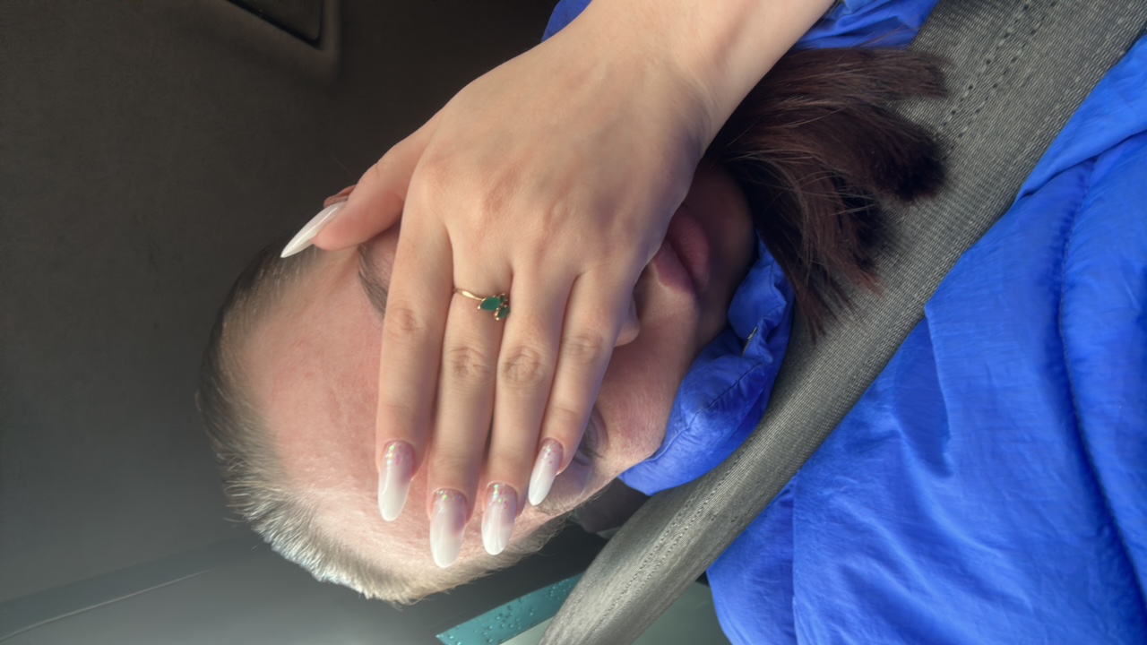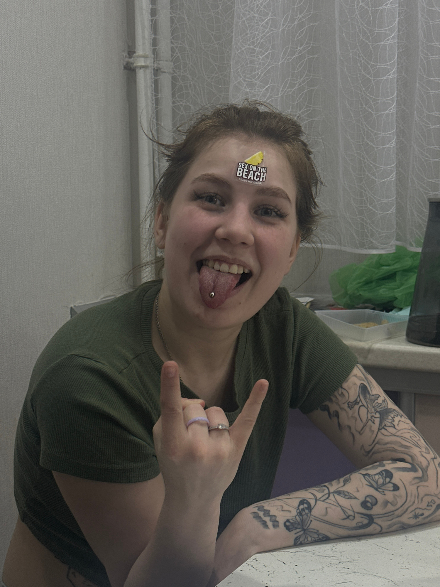 A fair-skinned young woman poses indoors, wearing a green short-sleeved shirt. She has light brown hair and a sticker on her forehead that reads "SEX ON THE BEACH". Her tongue is sticking out, reveali…read more