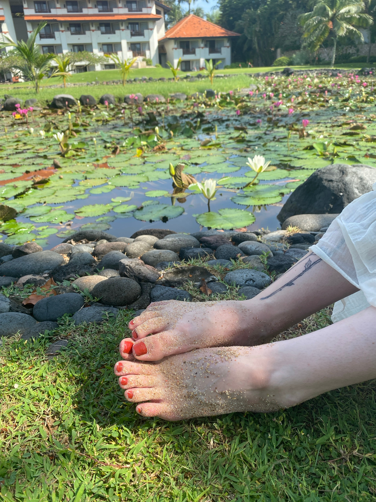 A person's feet with red nail polish are covered in sand and are resting on green grass. The person is wearing a white garment. Next to the feet are dark, smooth stones. In the background, there is a…read more