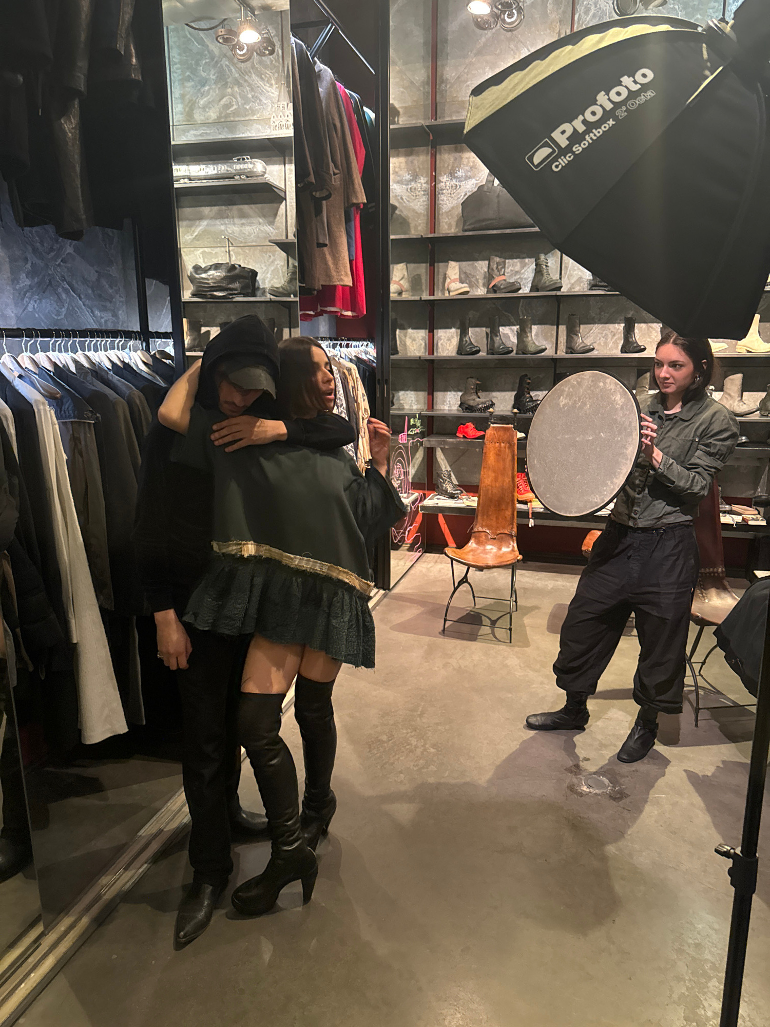 The image depicts a fashion shoot in progress. A woman in work clothes and a hair tie stands with a large reflector while a softbox light sits overhead on a stand. A second woman is being held by a ma…read more