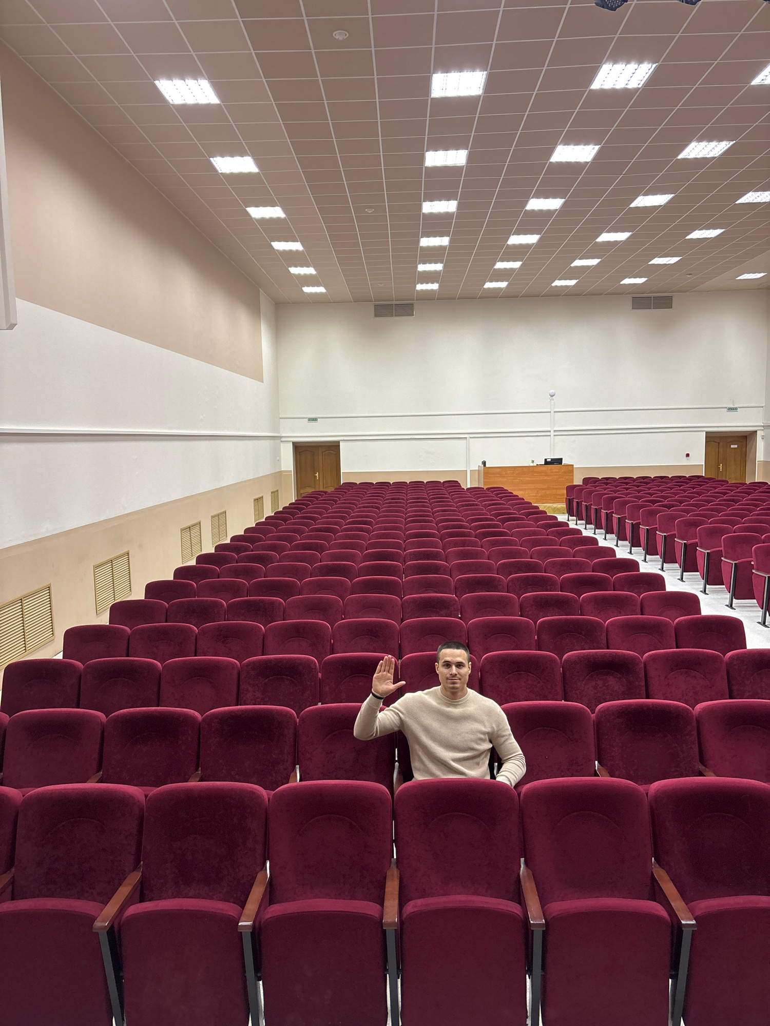 A man stands in an auditorium in the city of Chaikovsky, Russia. The auditorium features rows of maroon-colored upholstered seating. The man, wearing a light-colored sweater, is positioned within theβ¦read more