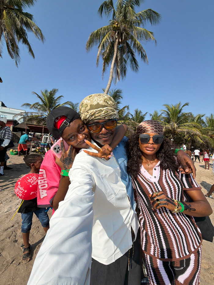This image captures three adults posing for a selfie on a sandy beach under a clear blue sky, located in Mopo Onijebu, Nigeria. In the foreground, a man in the center wears a white long-sleeve shirt…read more
