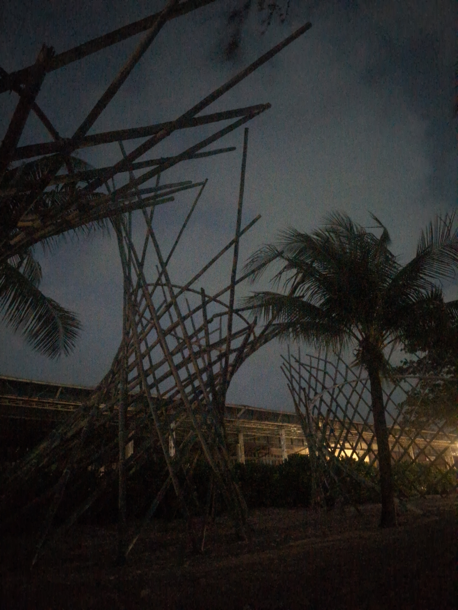 The image depicts a low-angle shot of a structure made of bamboo poles and woven lattice, likely a temporary construction or decorative element. Palm trees are partially visible, framing the structure…read more