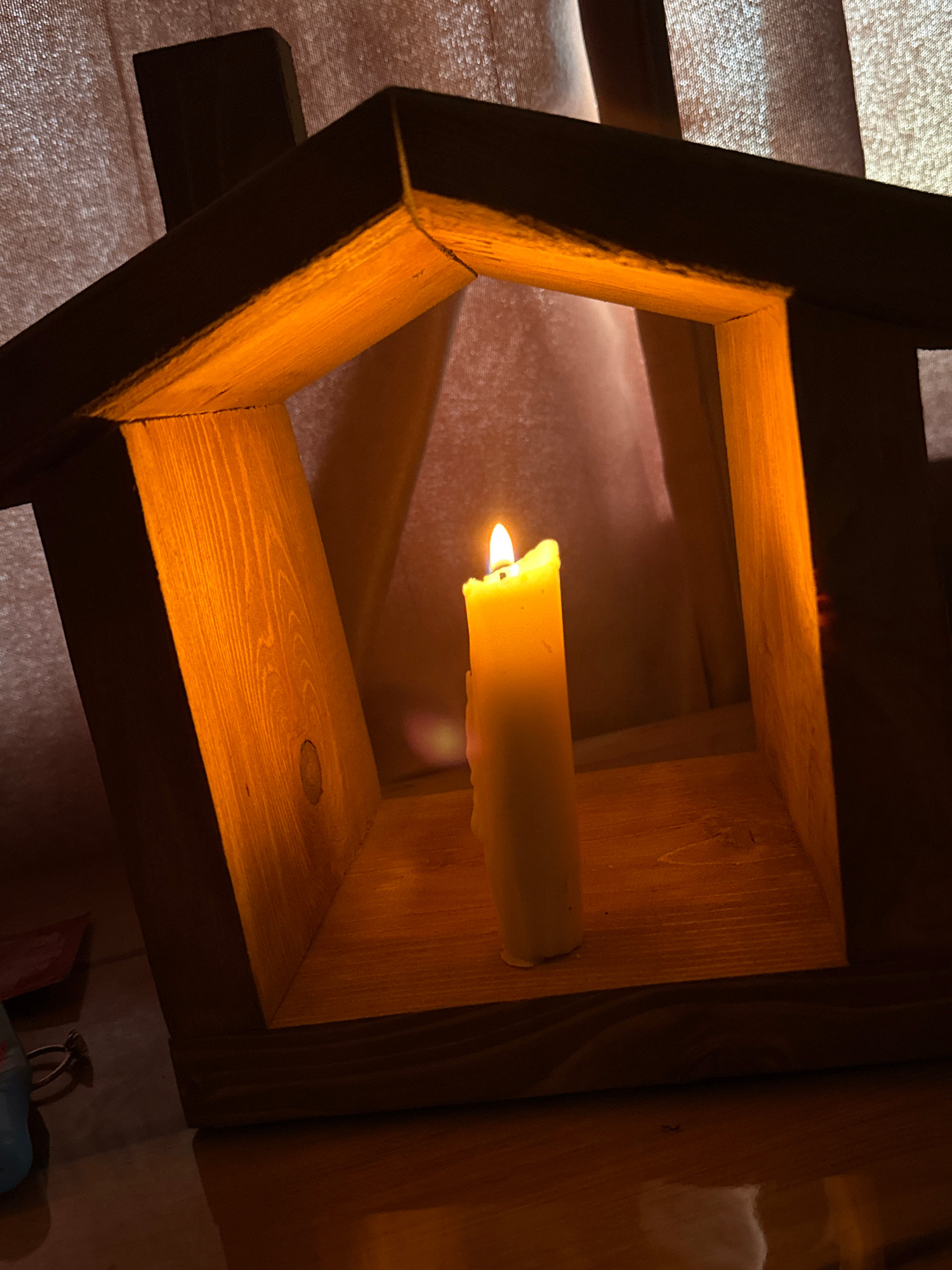 A burning candle is fixed to a wooden structure. The structure is a series of nested squares of wood. The wood grain is visible. The candle is cylindrical and pale yellow with a bright orange flame. T…read more