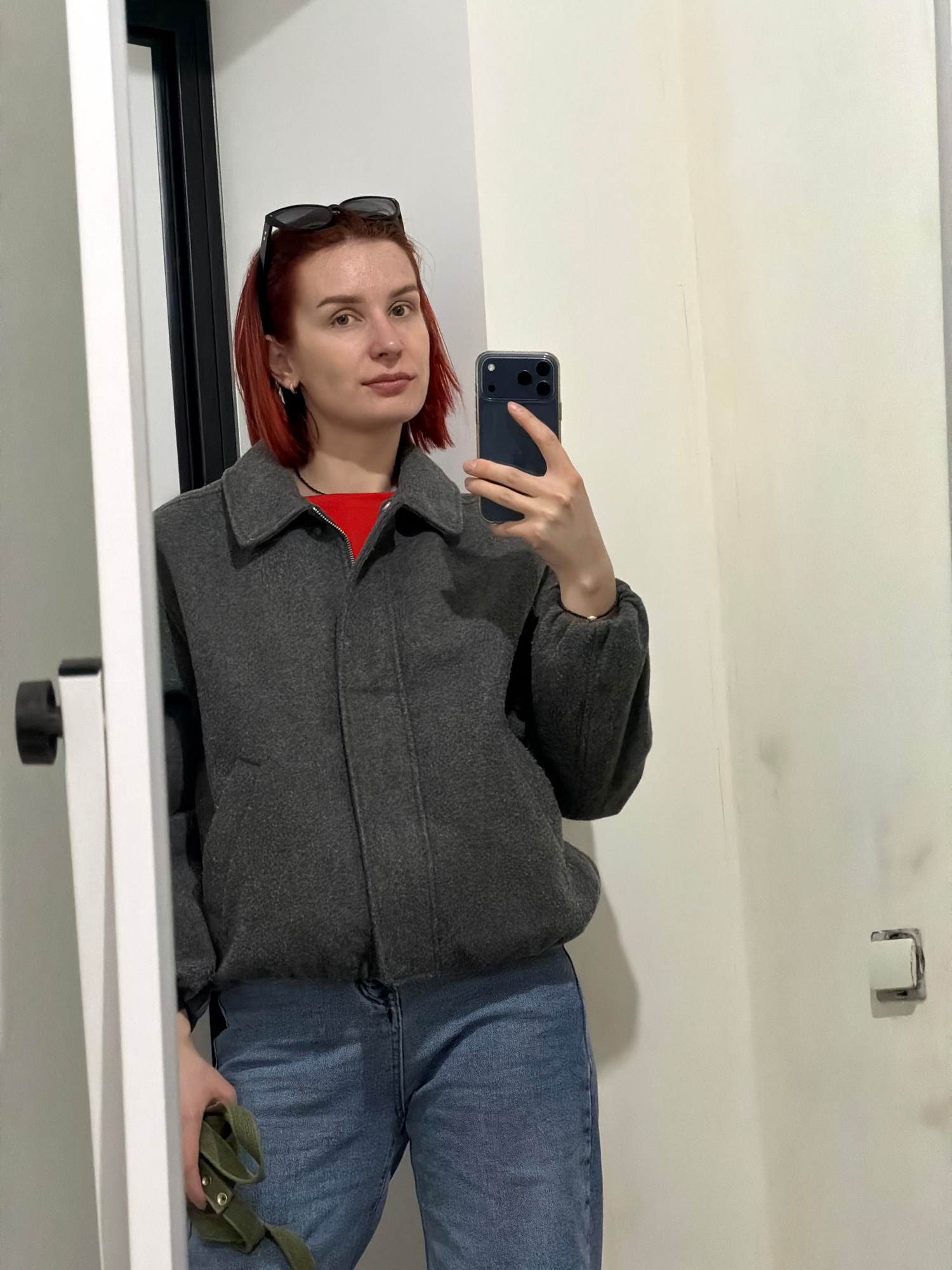 A woman stands in a white-walled room, taking a selfie with her mobile phone. She is wearing blue jeans, a red top, and a dark gray jacket. Sunglasses are perched on her head. Her hair is reddish-brow…read more