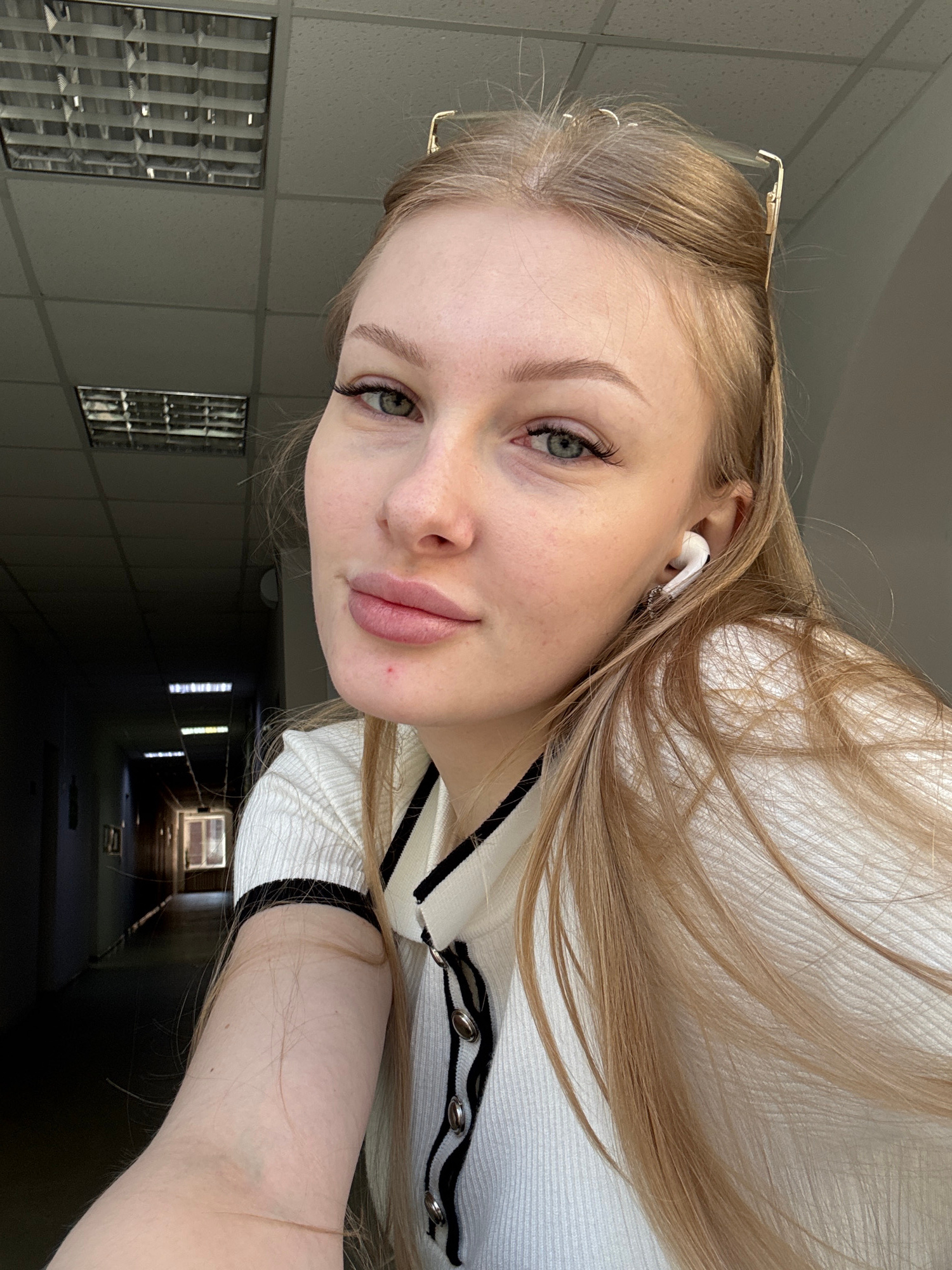A young woman with fair skin, light blonde hair, and wearing an earbud in her left ear is the subject of this selfie. She is wearing a white top with black trim and decorative buttons. She also has gl…read more