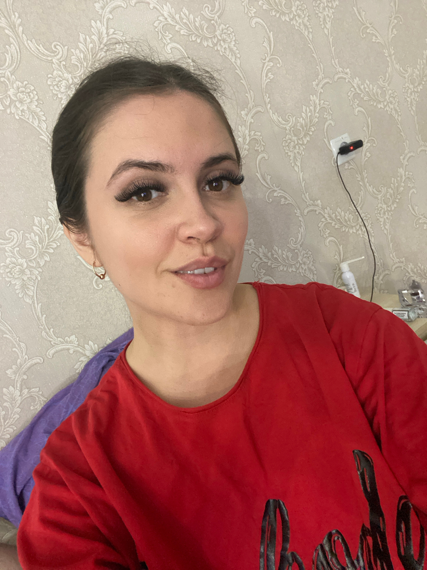 A woman is facing the camera, wearing a red t-shirt with black writing and a purple scarf/cloth. She has brown hair and eyelashes. The background features patterned wallpaper, an electrical outlet wit…read more
