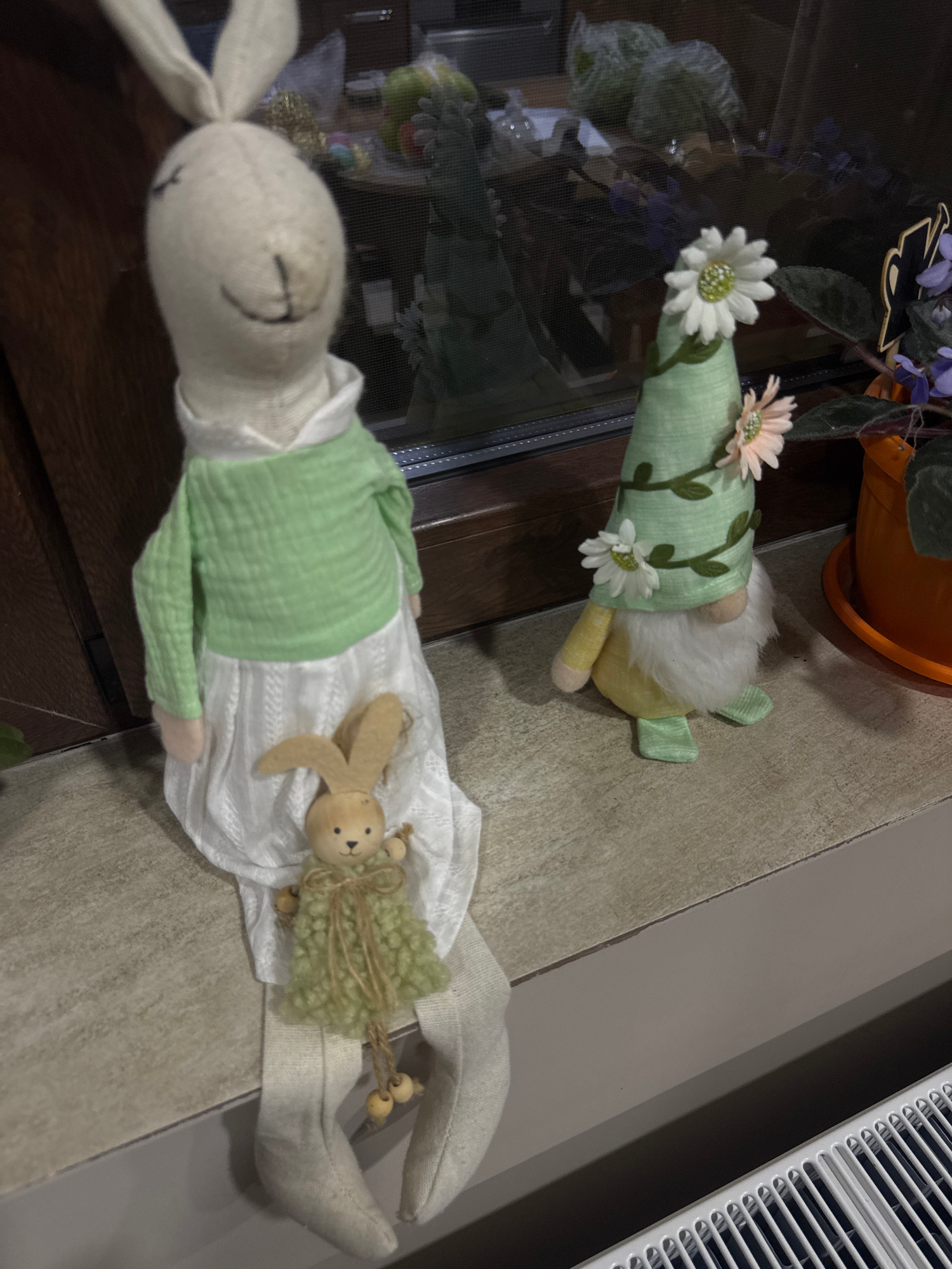 The image shows a close-up, tilted view of two stuffed toys. One is a reclining rabbit figure dressed in white with a green overlay, accompanied by a small, wooden toy rabbit resting on its dress. The…read more