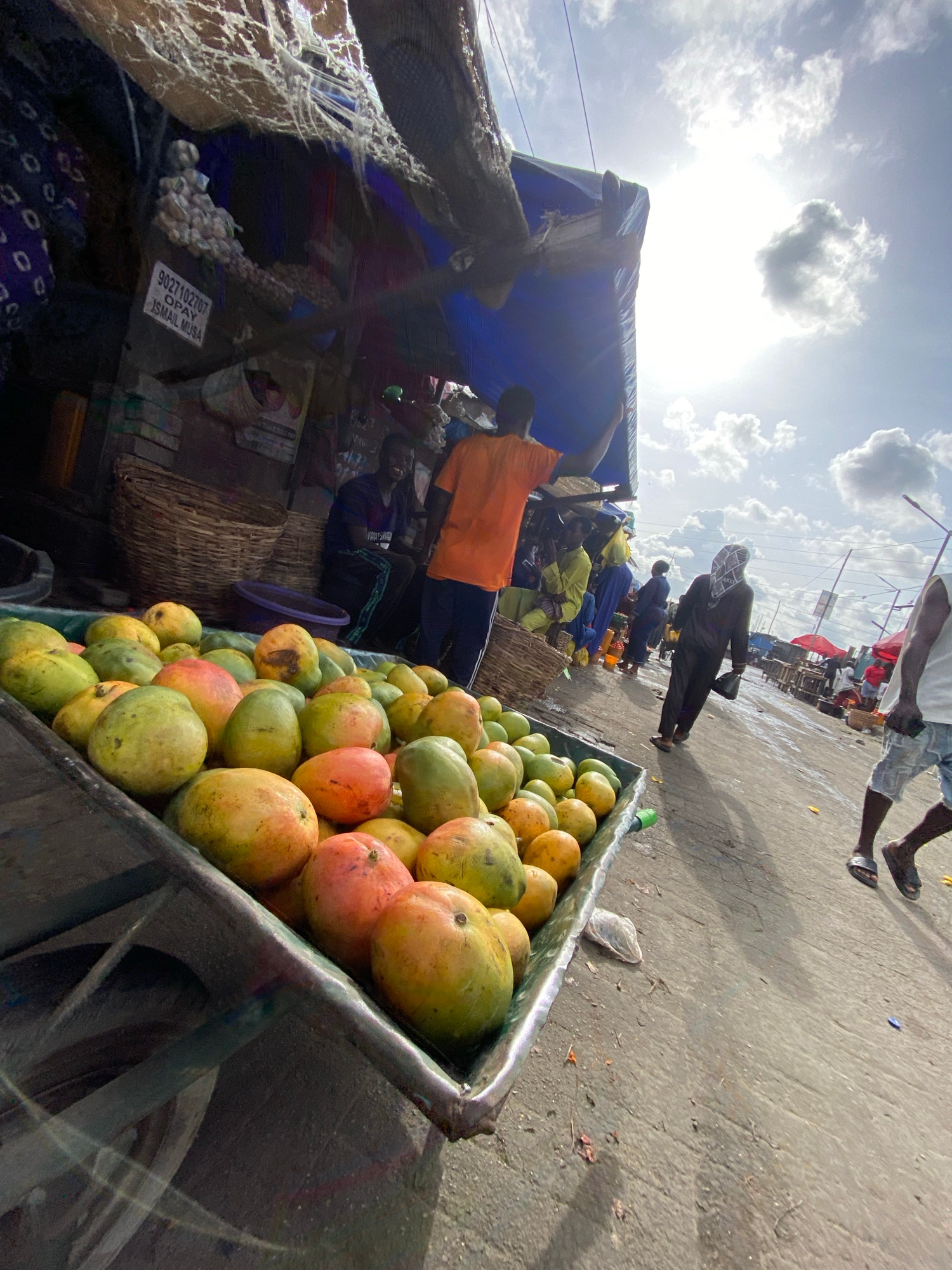 The image depicts a bustling street scene, likely a market, in Lagos, Nigeria. In the foreground, a cart overflows with mangoes, varying in ripeness from green to red-orange. People walk along the sid…read more