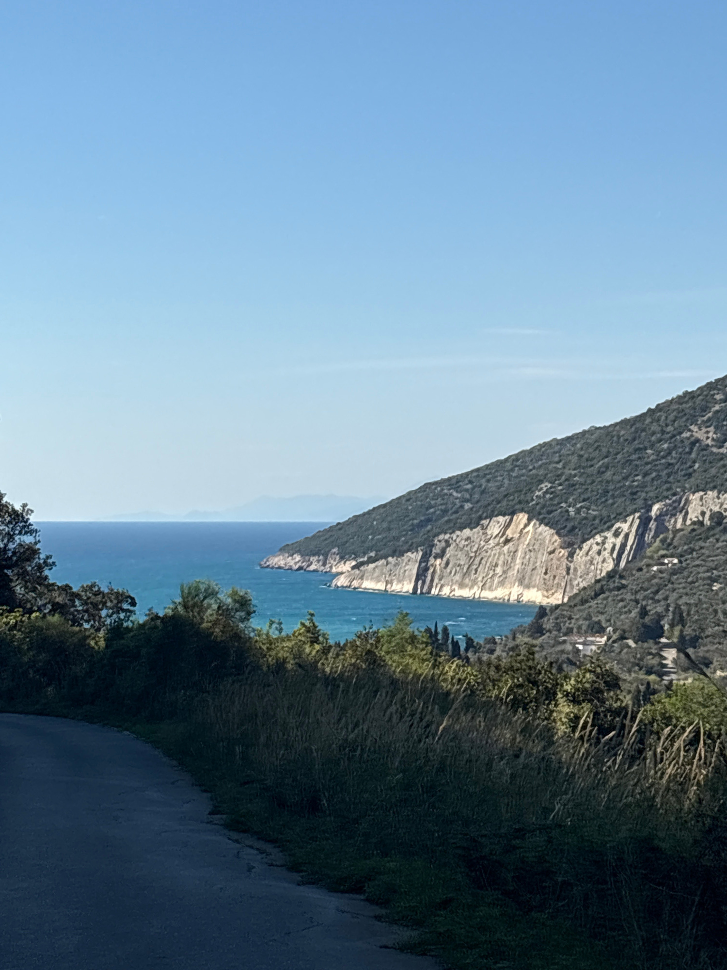 View of a cliff face covered in trees that drops straight down into the ocean next to a road in Bratica, Braticë, Montenegro. The sky is a pale blue. The ocean is a darker blue. The road is on the rig…read more