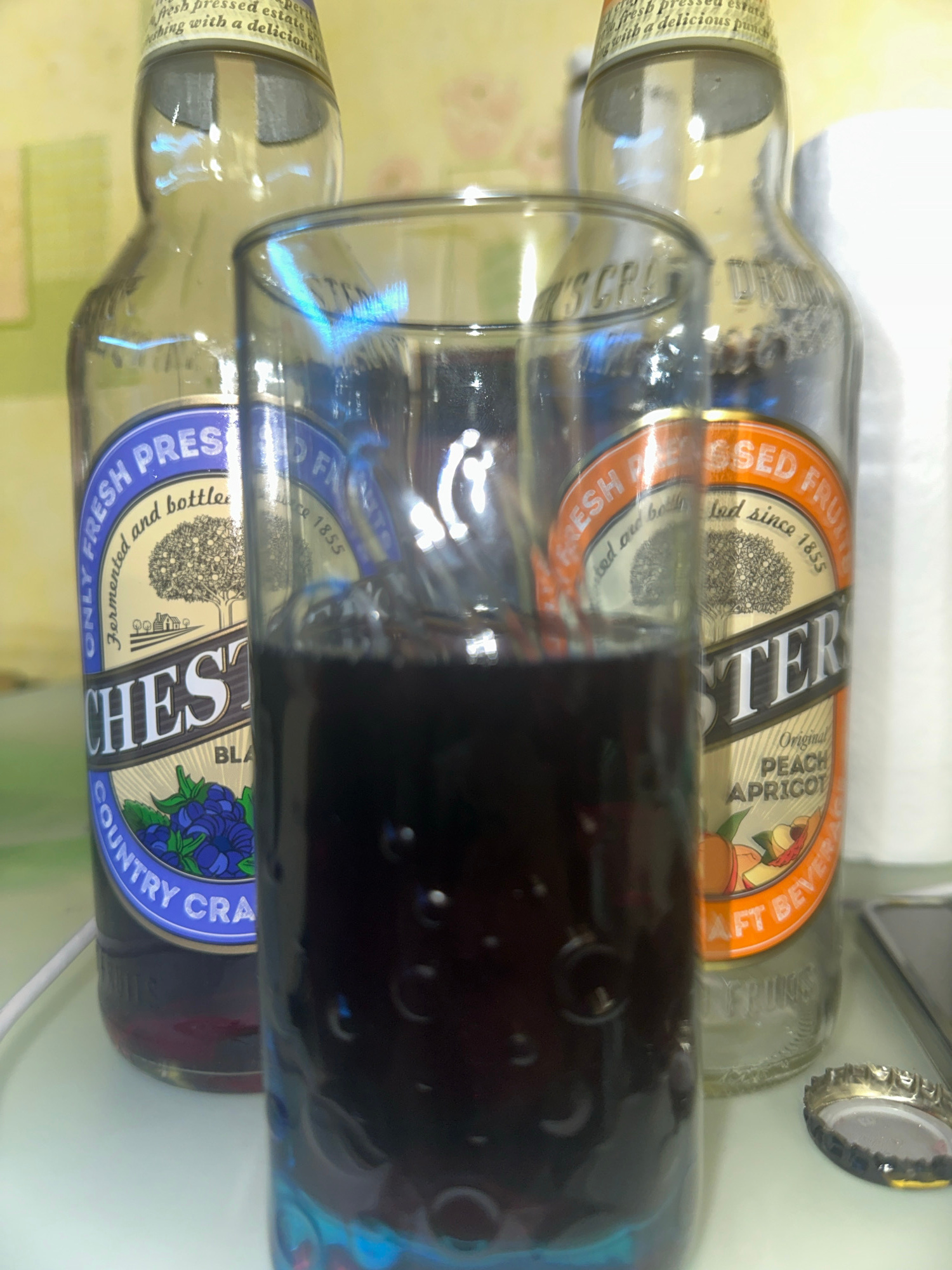 The image shows two bottles of 'Chester's' brand beverages lying on their sides. One is 'Original Peach Apricot' flavor, the other 'Country Craft Blackberry'. A glass filled with dark liquid is placed…read more