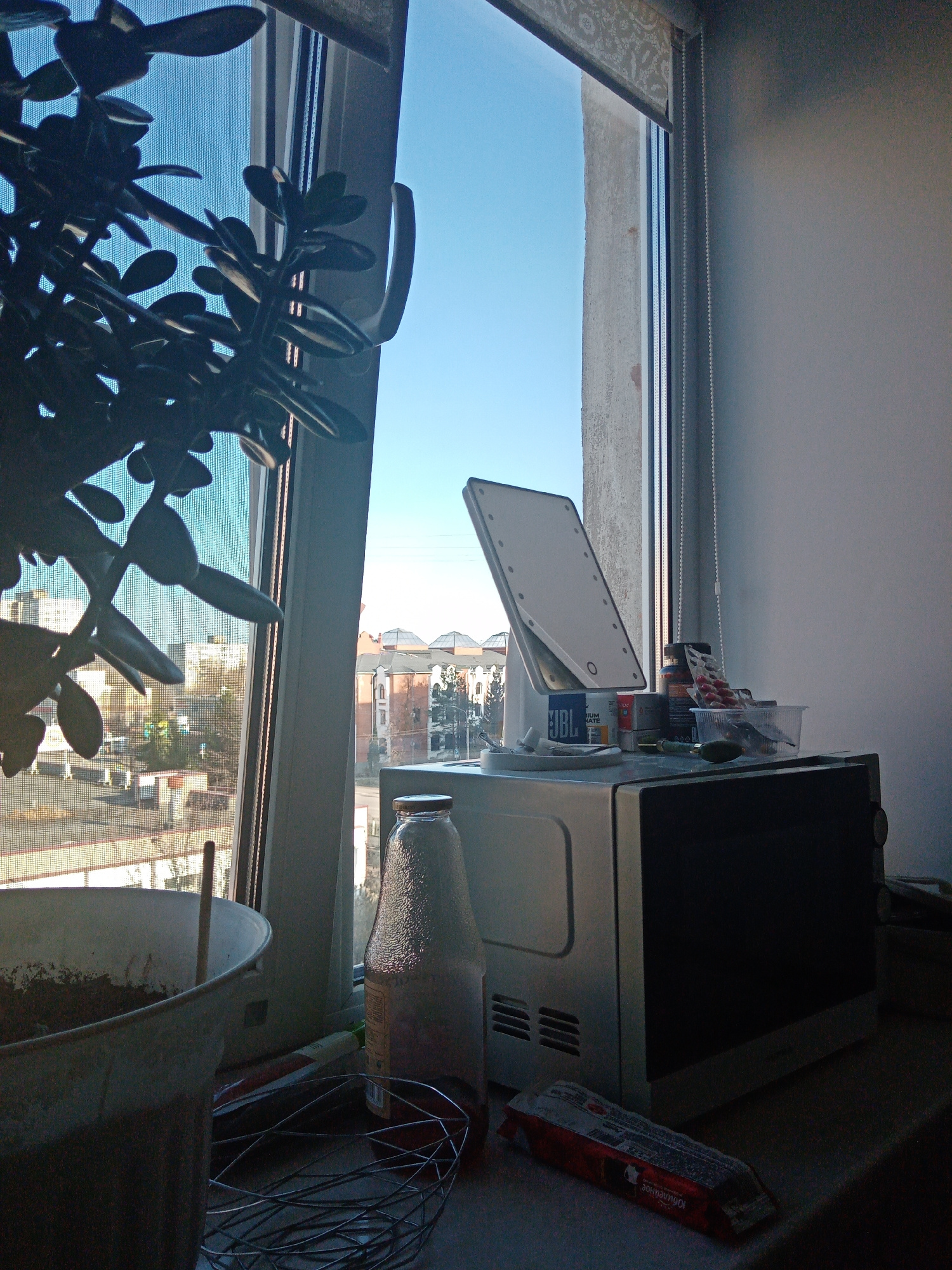 A partially obscured window view in Elektrostal, Russia reveals a clear blue sky and residential buildings. A houseplant occupies the left foreground. Various objects, including a bottle, microwave, i…read more