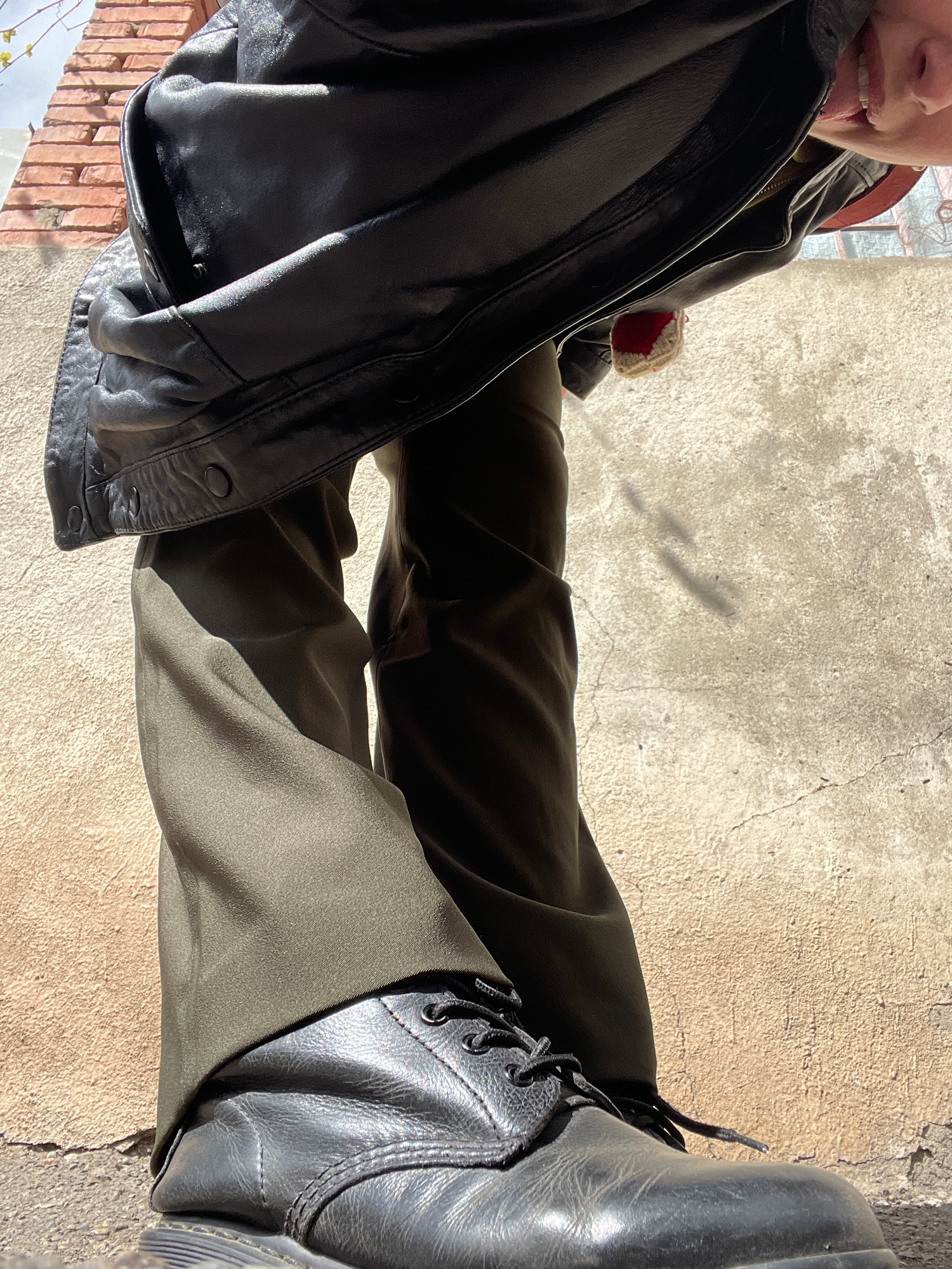 A person wearing black boots and olive drab trousers stands on a concrete surface. A black leather jacket hangs in the background. The location is Tbilisi, Georgia. The picture is taken from above, pa…read more