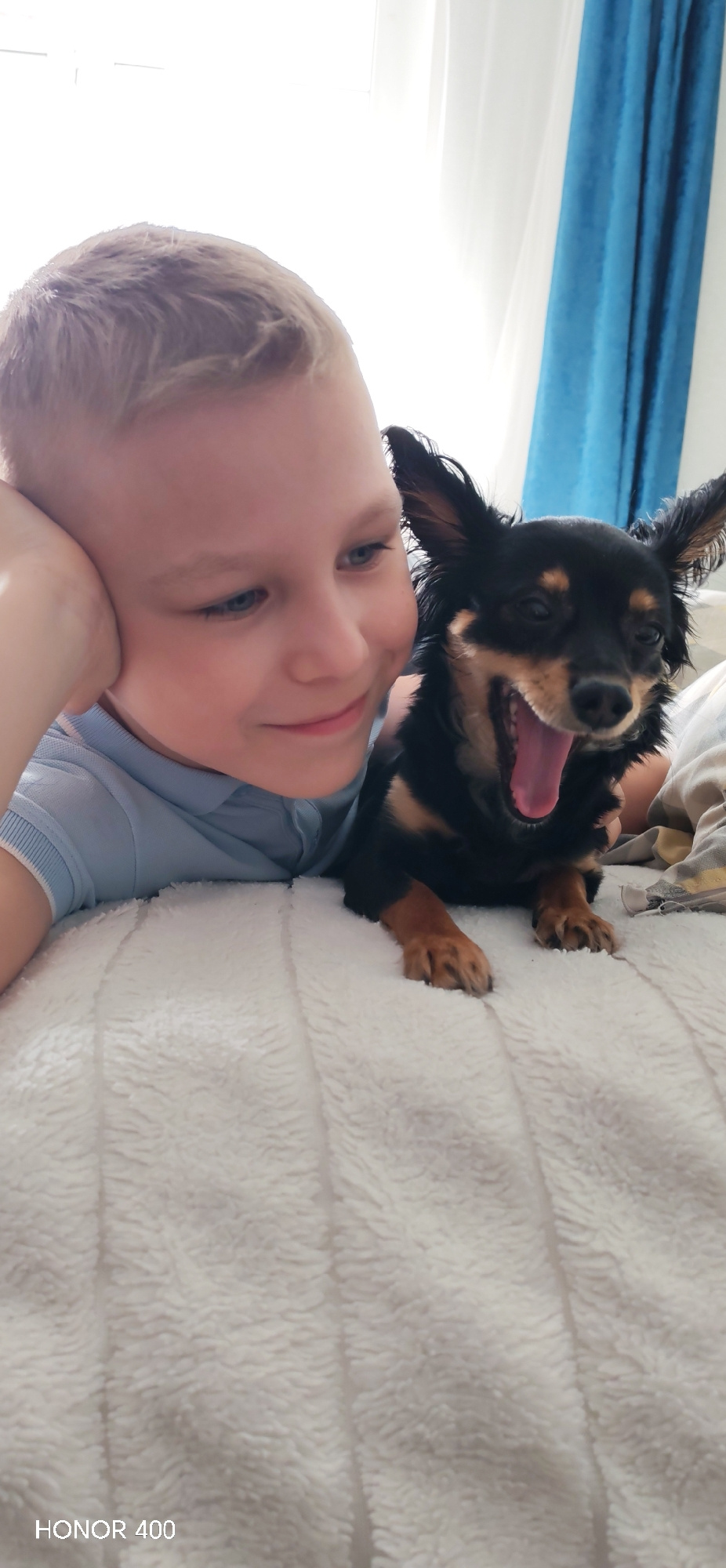 A boy lies next to a yawning dog on a white blanket in a room. The boy, who has blond hair and blue eyes, wears a light blue collared shirt and rests his head on his hand, smiling at the dog. The dog,…read more