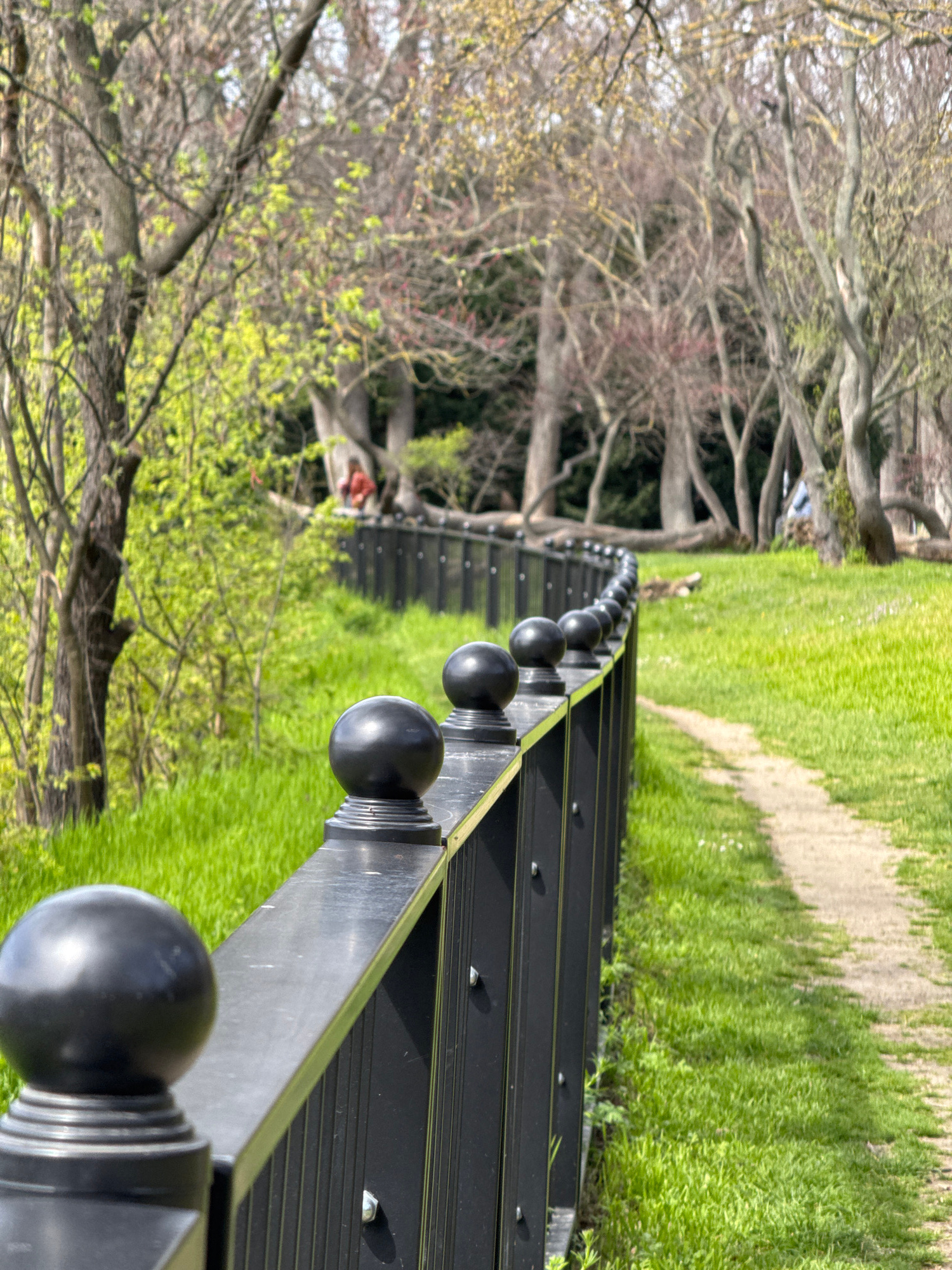 The image shows a black metal fence with spherical finials running along a grassy path. The path is bordered by trees on either side, some of which are budding with green leaves. In the distance, a br…read more
