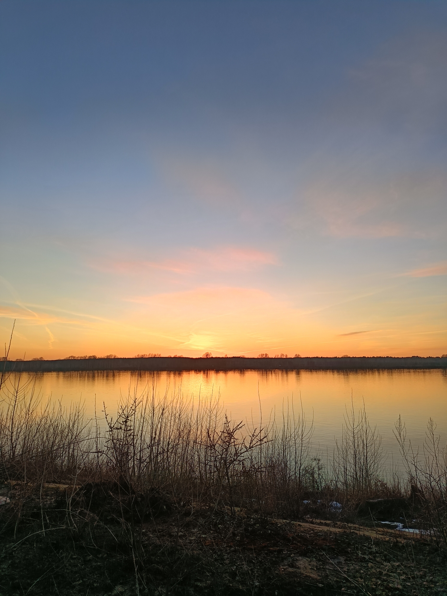 The image displays a serene natural landscape at either sunrise or sunset, likely over a river in the Chaikovsky, Russia region. The sky dominates the upper half, transitioning from a clear, deep blue…read more