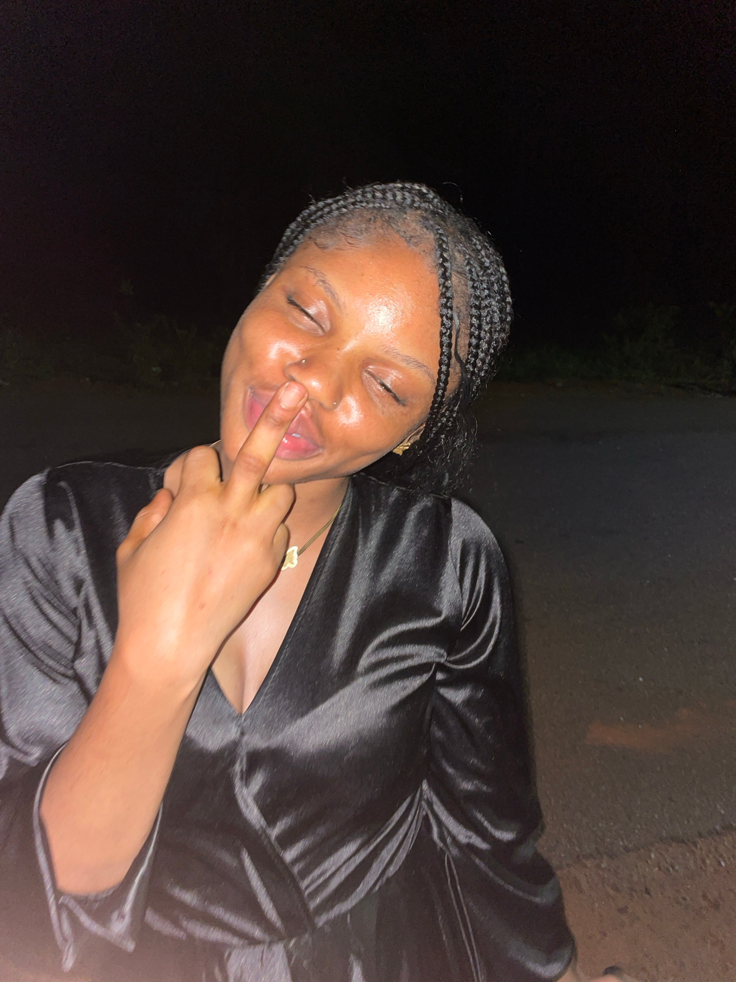A close-up image, oriented roughly 90 degrees clockwise, captures a young Black woman in a playful moment at night, likely in Ogbe, Nigeria. She is looking towards the viewer with her eyes closed and…read more