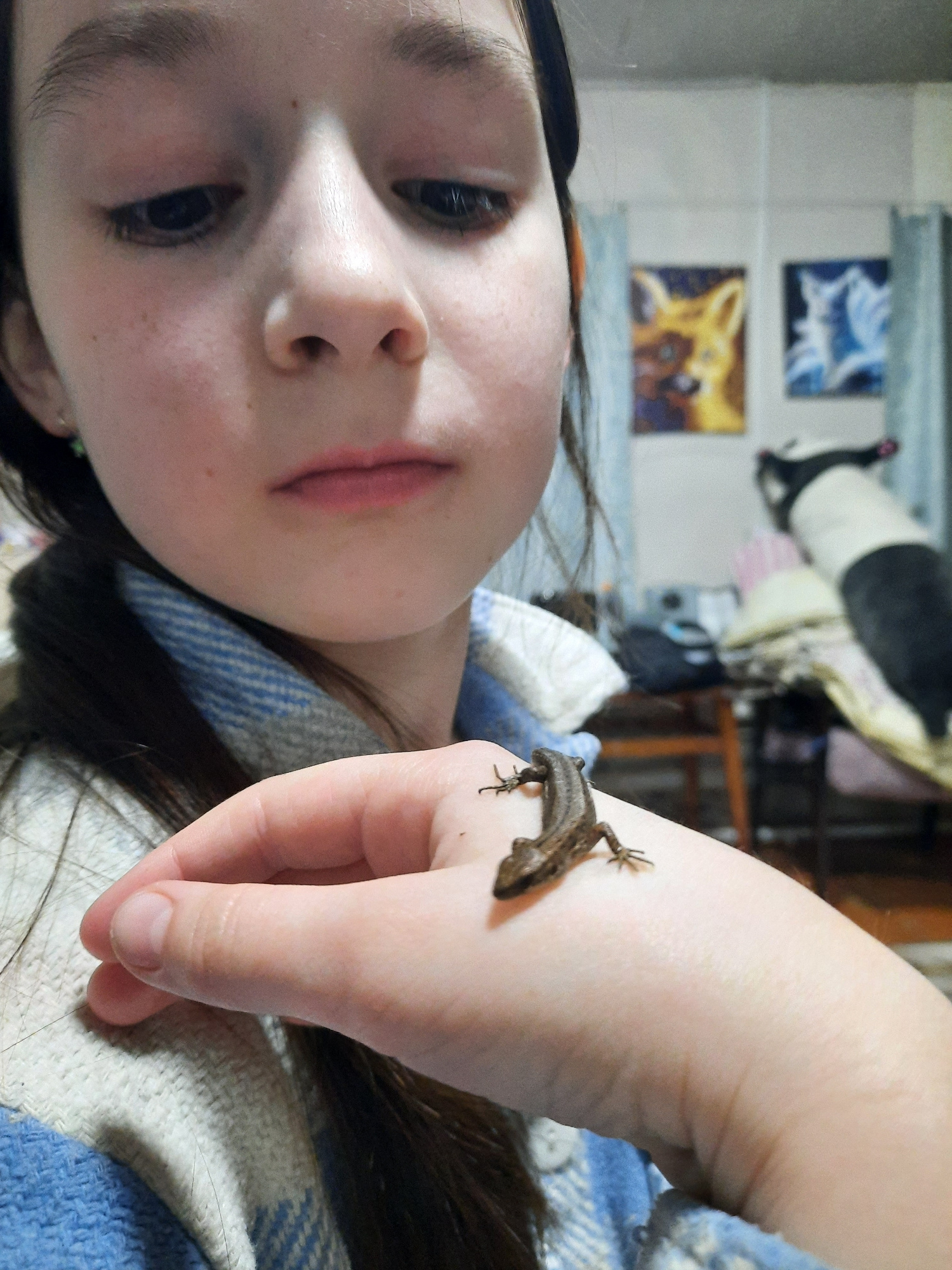 A young person is lying down, looking at the camera. A small lizard is on their hand. The surrounding environment includes what appears to be a room with pictures on the wall and various items scatter…read more
