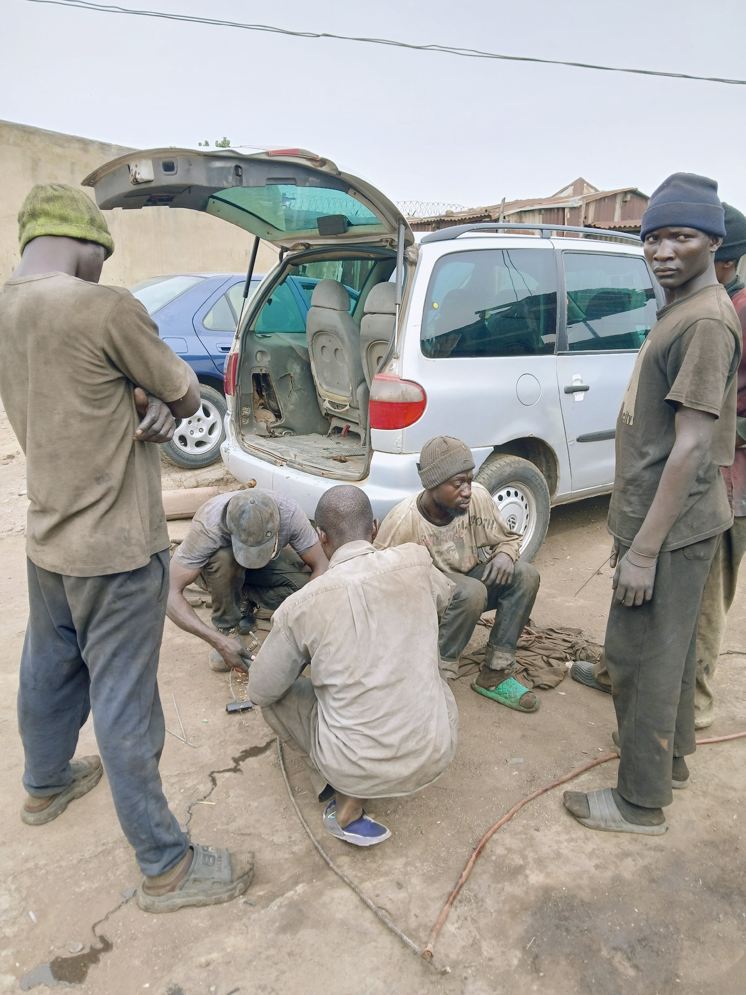 The image captures an outdoor auto repair scene in Rafin Par, Nigeria, featuring five men engaged in vehicle maintenance. The setting appears to be an informal workshop or roadside area with a dirt an…read more
