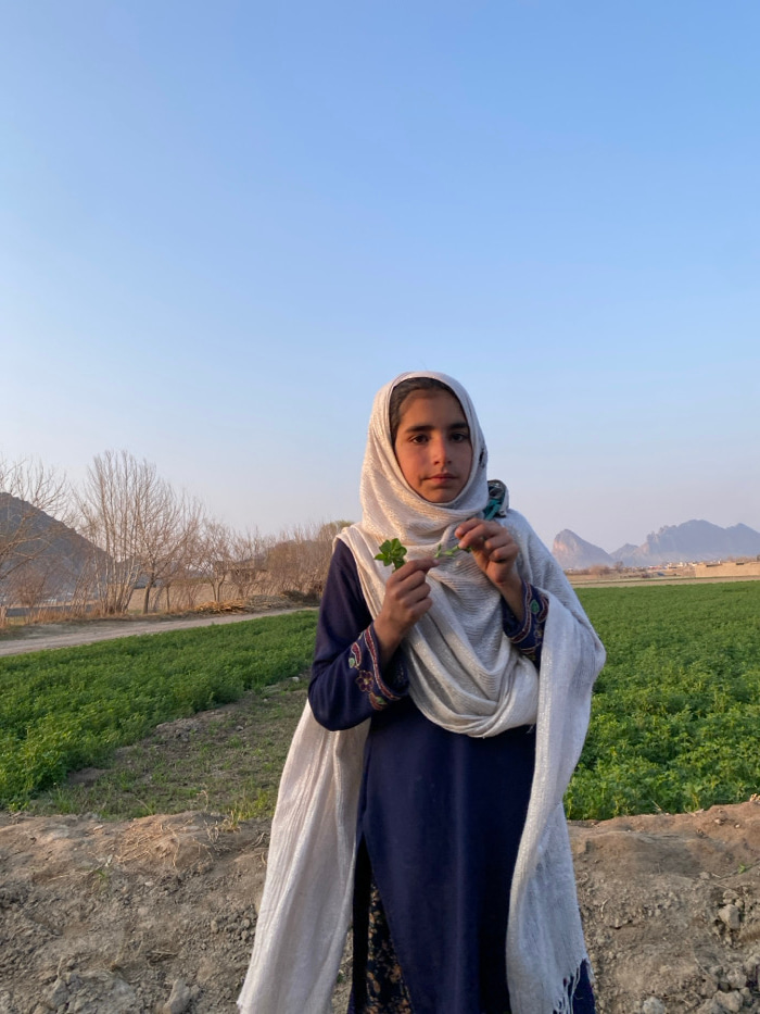 A young female subject stands centrally in an outdoor agricultural setting within the city of Kandahar, Afghanistan. She faces the viewer with a neutral expression. The subject is dressed in a dark bl…read more