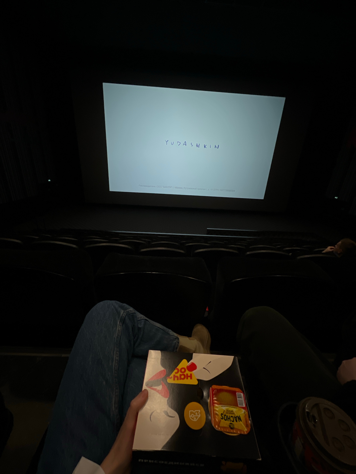A person is sitting in a movie theater, holding a box of nachos and a drink. The movie screen shows the name "Yudashkin" with Russian text below it. The text suggests the movie is being shown in Mosco…read more