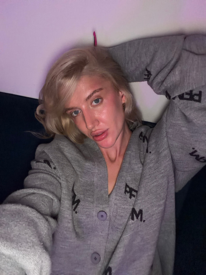 A light-skinned blonde woman wearing a gray cardigan with black lettering is lying on a dark blue surface. The cardigan is buttoned and has a ribbed texture. Her head is tilted towards the camera. She…read more