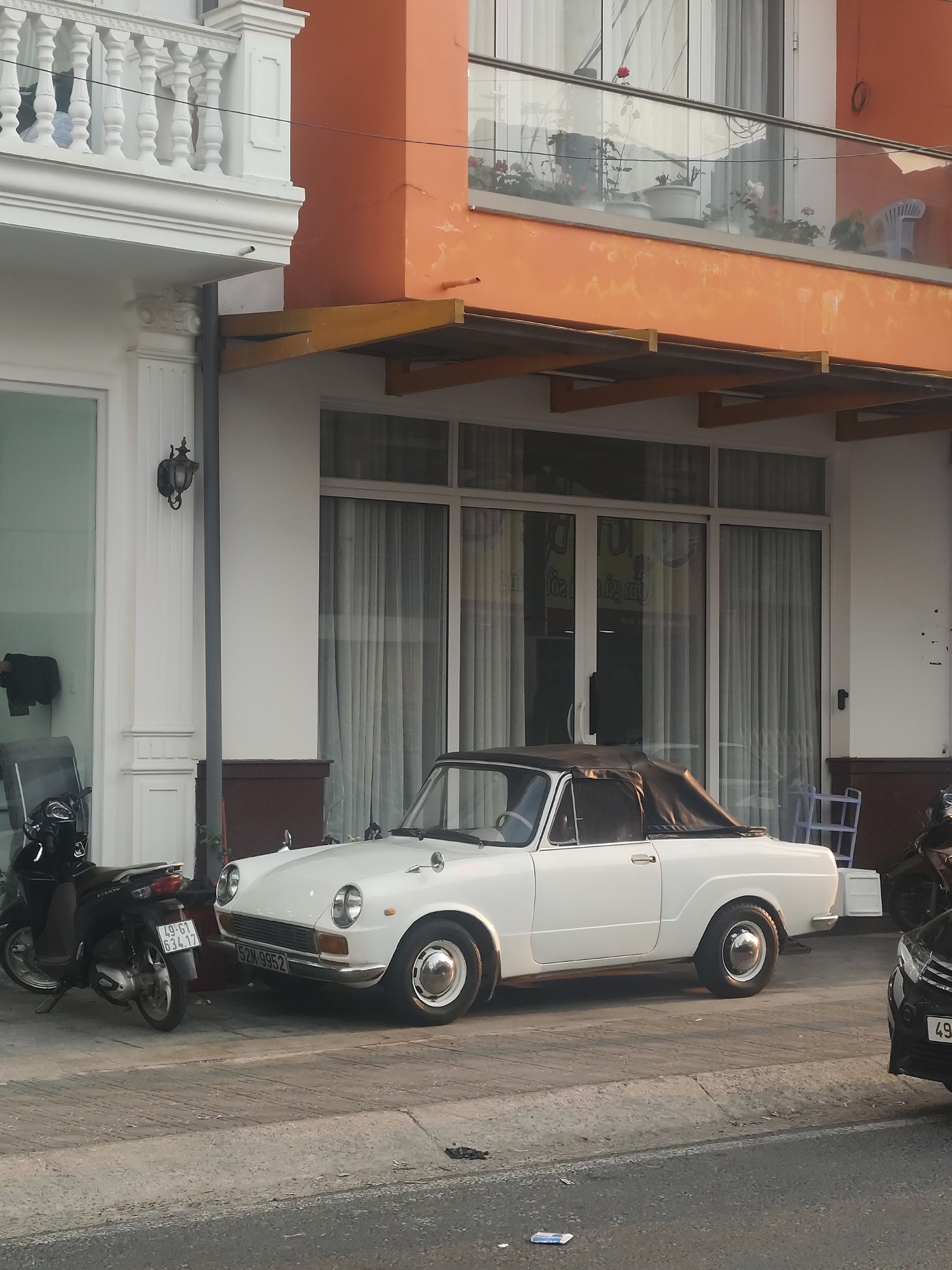 The image captures a street scene in Da Lat, Vietnam. A vintage white convertible car with a black soft top is parked along the sidewalk. To the left of the car is a black scooter, and to the right, t…read more
