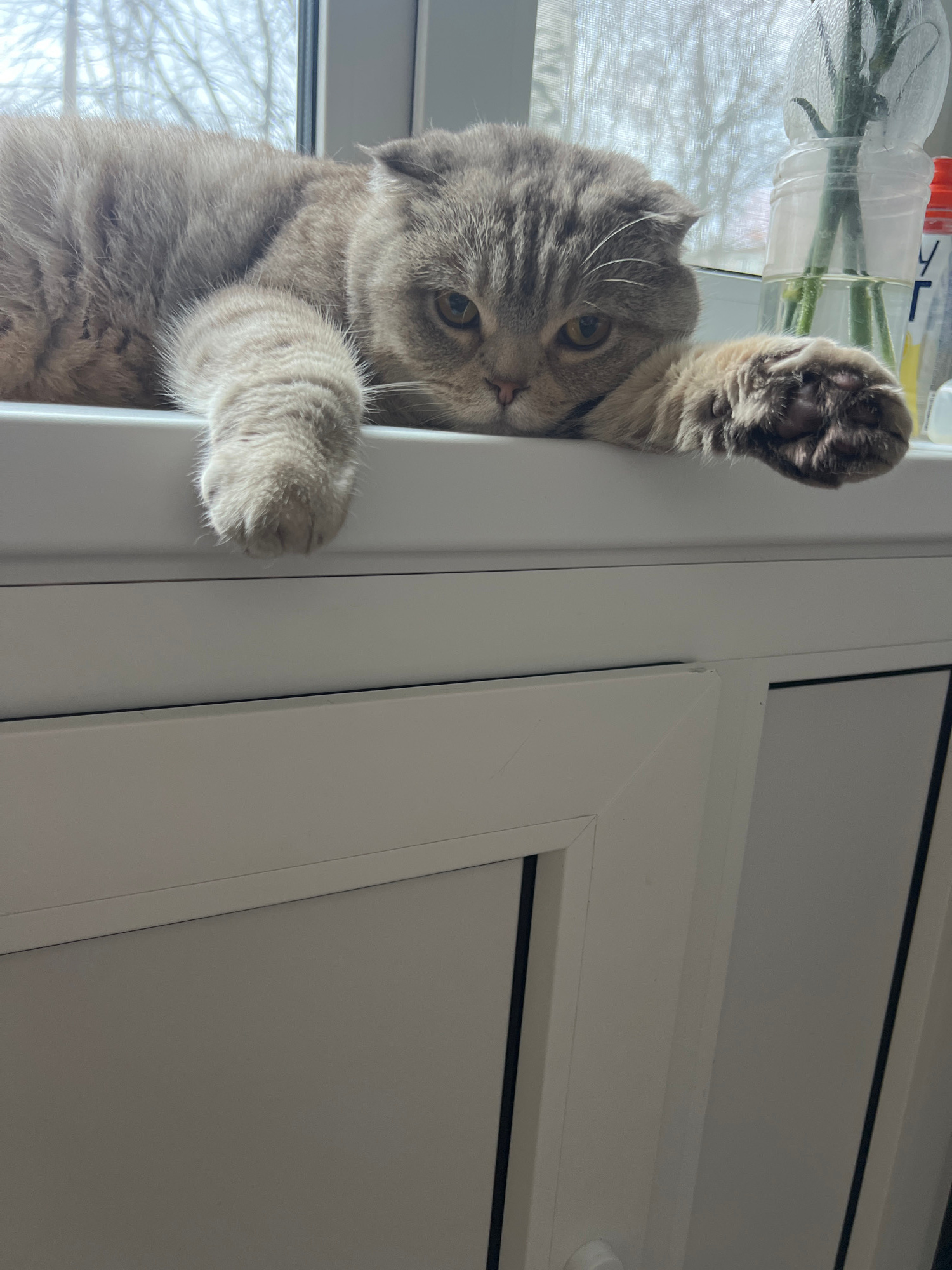 A gray Scottish Fold cat is hanging onto a white door frame. The cat is positioned vertically, with its head and upper body visible, and its paws gripping the frame. The cat has round, yellow eyes and…read more