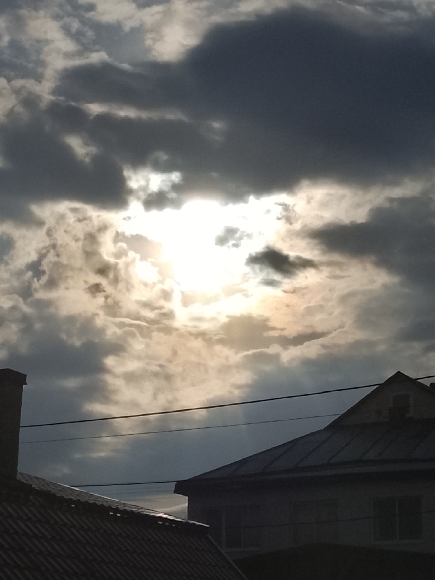 The image depicts a cloudy sky with the sun shining through the clouds. Below the sky, the roofs of two buildings are visible. The buildings are located in Chaikovsky, Russia. One building appears to…read more