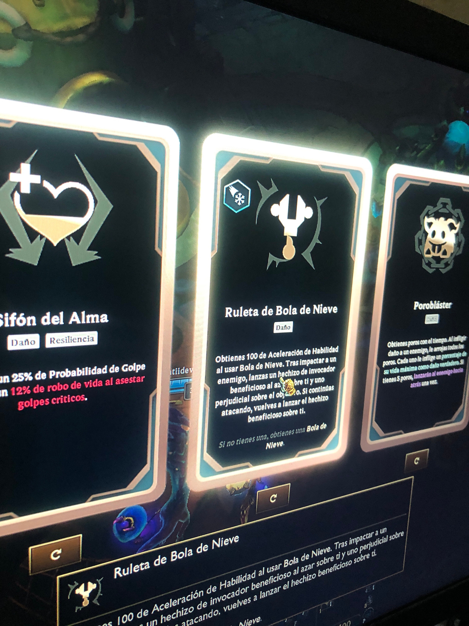The image shows a close-up of a screen displaying in-game cards from a video game. The cards are laid out in a row, each with different titles and descriptions written in Spanish. The first card is ti…read more