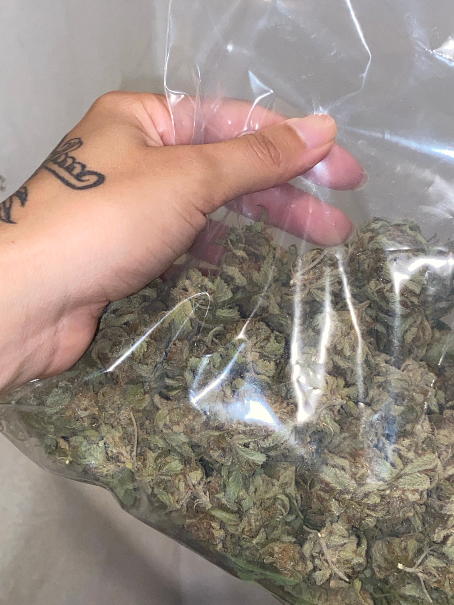 A person's hand holds a clear plastic bag filled with marijuana. The hand has a tattoo on the wrist. The bag appears full of dried flower buds. The scene's specific location within Monte Grande, Argen…read more