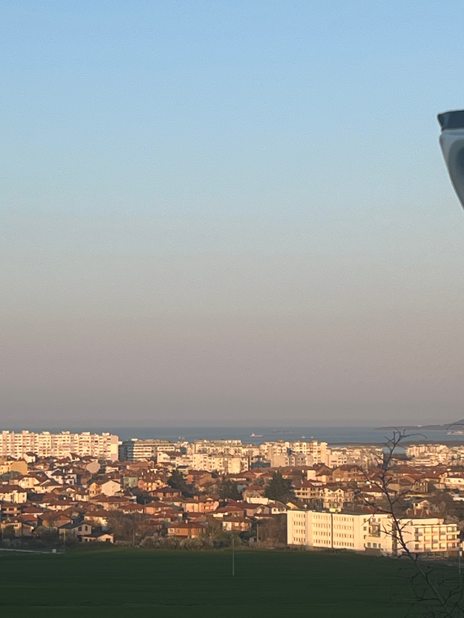 This photograph shows a panoramic view of a city, likely Burgas, Bulgaria. The city is situated along a coastline, visible in the distance. The foreground includes a green field and a close-up view ofโฆread more