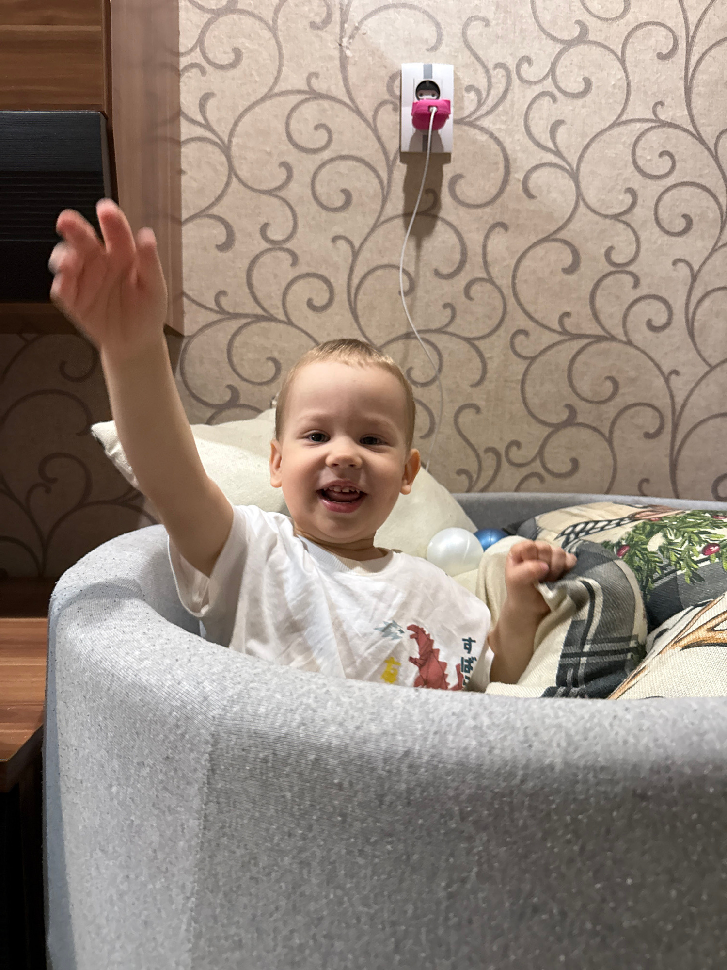A young child lies sideways on a grey sofa in a room. The child is wearing a white t-shirt with a dinosaur print. The child smiles with mouth open and left arm outstretched. The background includes be…read more