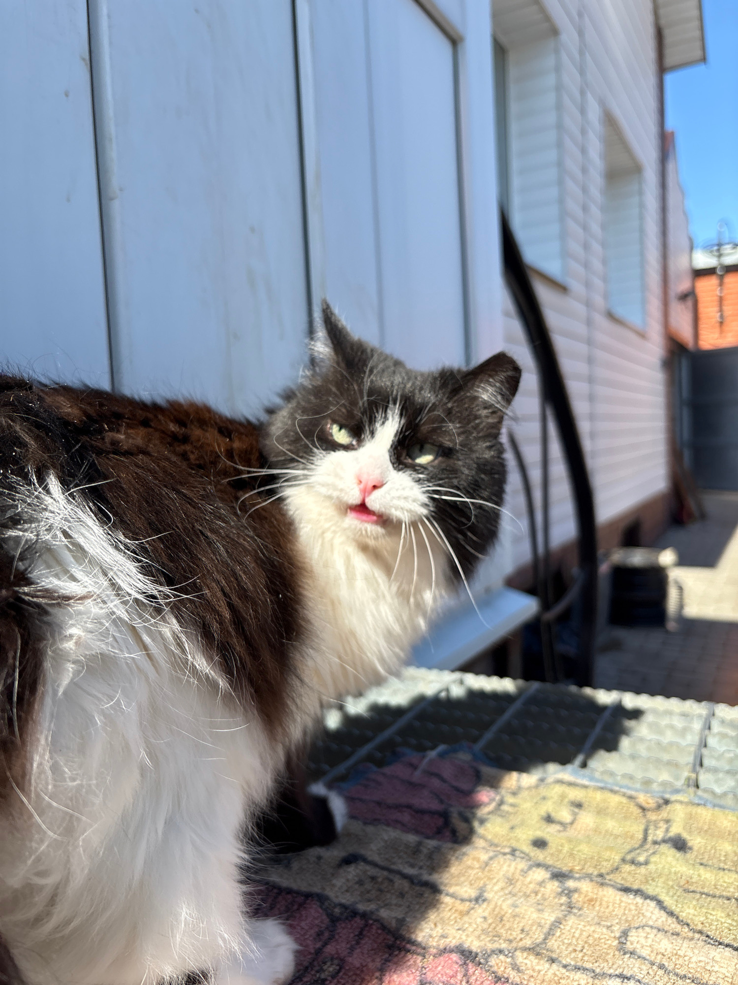 A black and white cat with a pink nose and tongue is sitting on a patterned mat, looking at the camera. The cat is partially in the shade. Behind the cat, there is a white siding wall and a glimpse of…read more