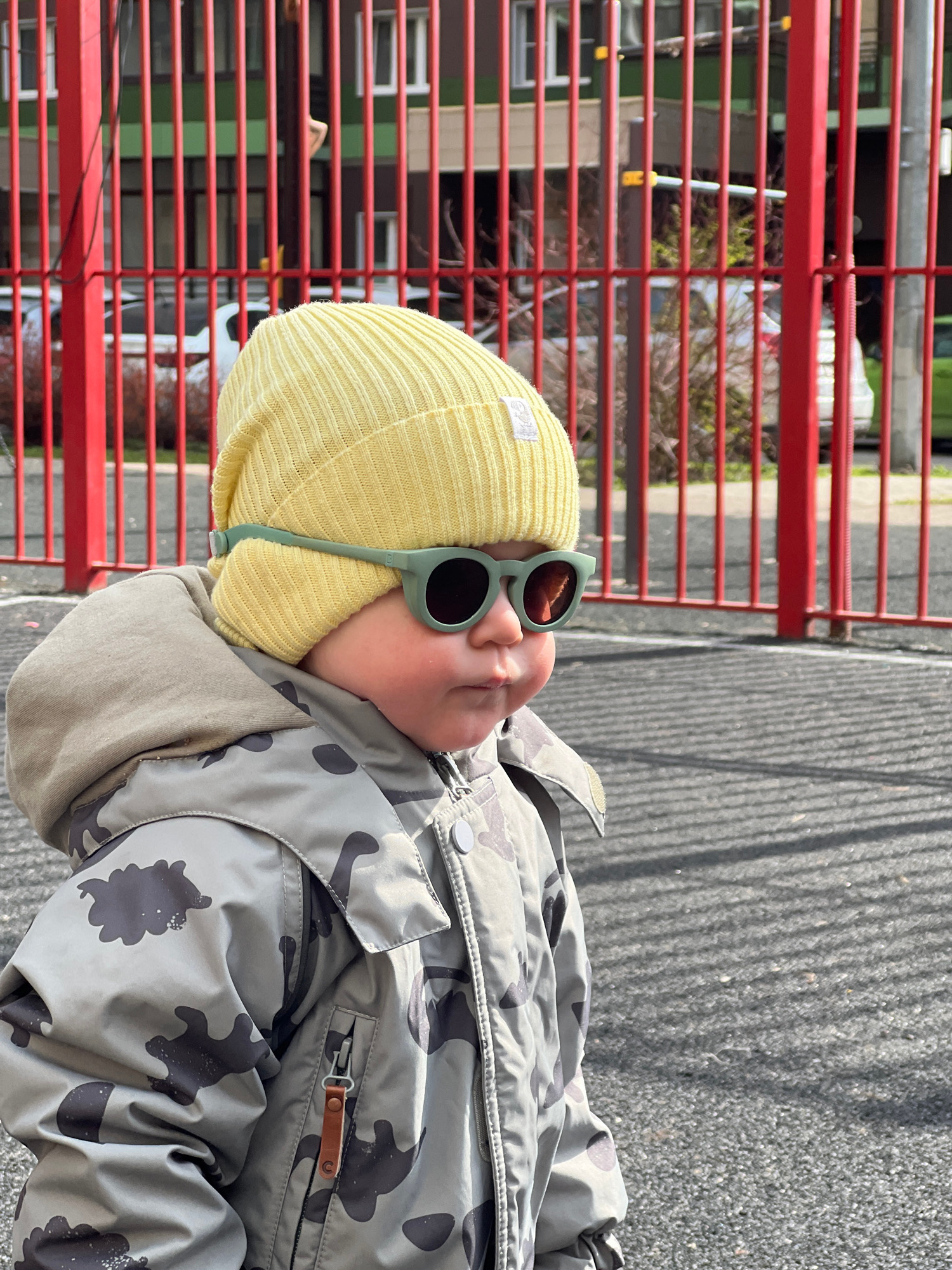 A child, wearing a yellow beanie, round green sunglasses, and a camouflage jacket, is positioned next to a red metal structure. The surface visible in the background is gray with patterns suggesting a…read more