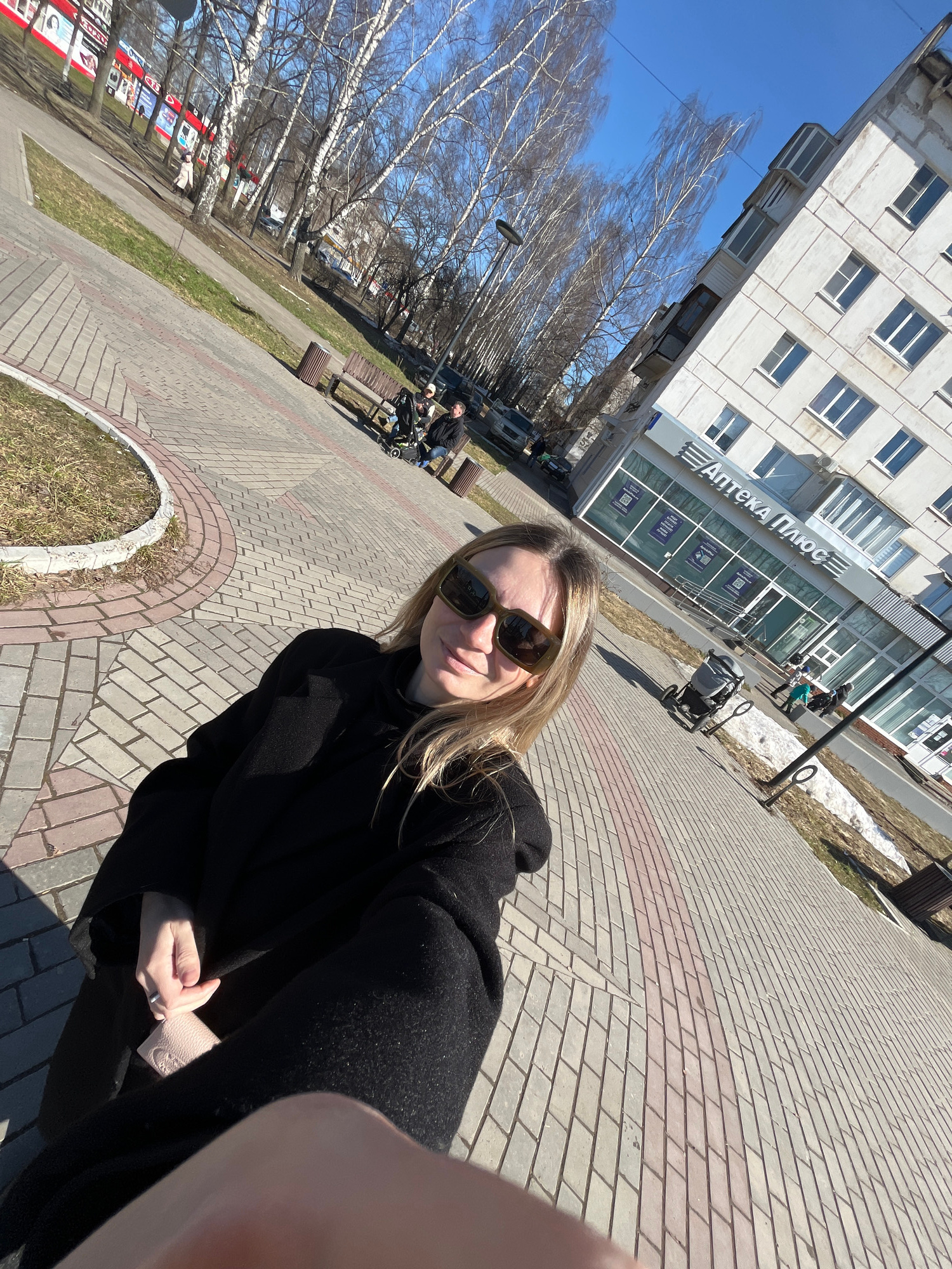 A woman wearing a black coat and sunglasses is taking a selfie on a sunny day in Chaikovsky, Russia. The background includes a building labeled "Аптека Плюс" (Pharmacy Plus), a sidewalk with a circula…read more