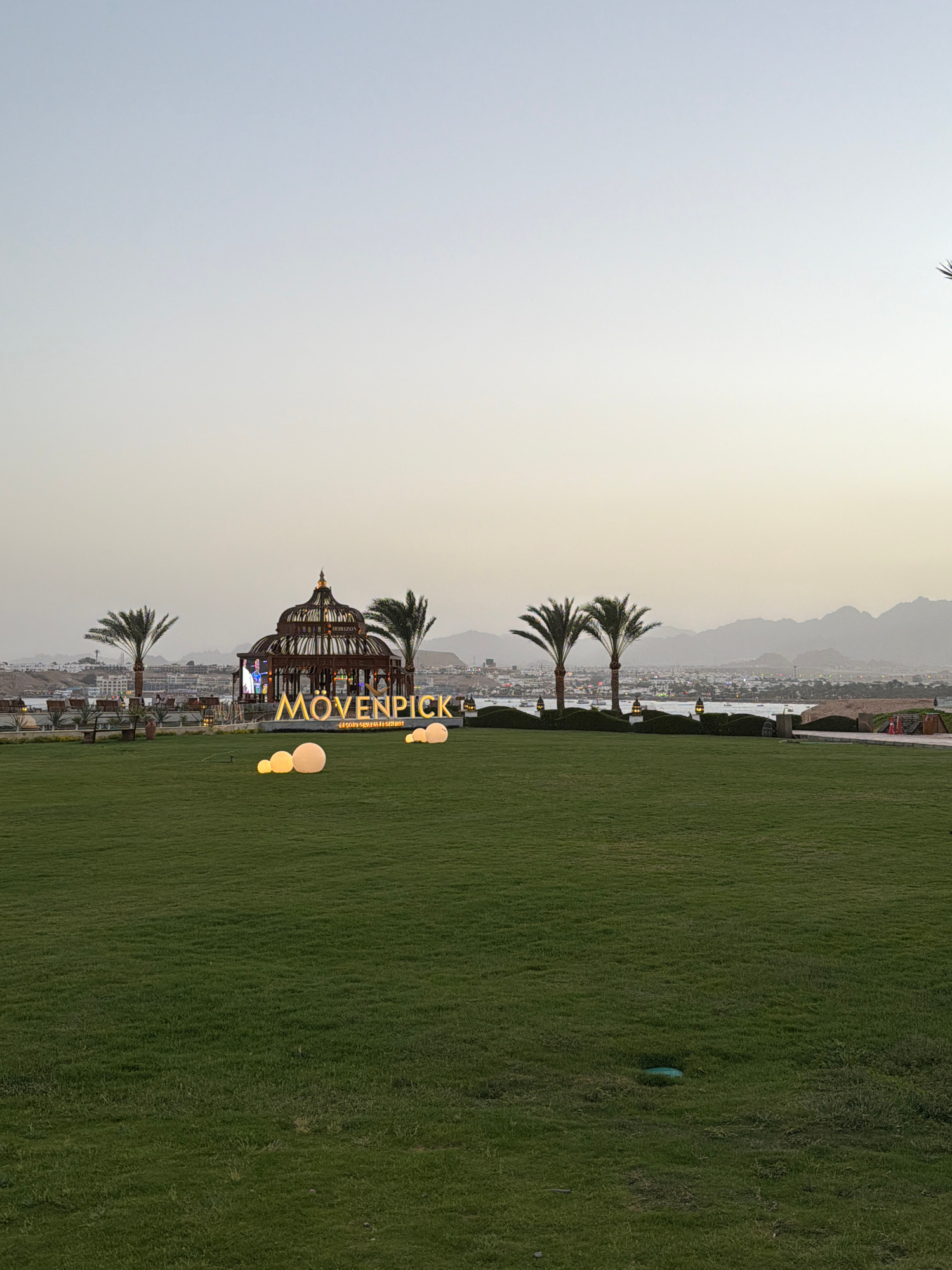 The image depicts an outdoor setting in Sharm El Sheikh, Egypt, near a Mövenpick hotel. The scene includes a grassy lawn, several palm trees, and a decorative structure resembling a birdcage, illumina…read more