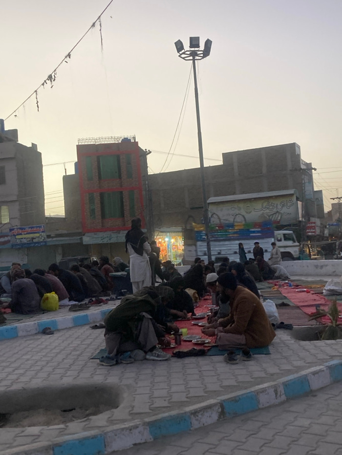 The image depicts an outdoor scene at dusk in Quetta City Tehsil, Pakistan. Approximately 30-40 adult males, dressed in traditional attire, are seated on red mats covering a paved area with interlocki…read more